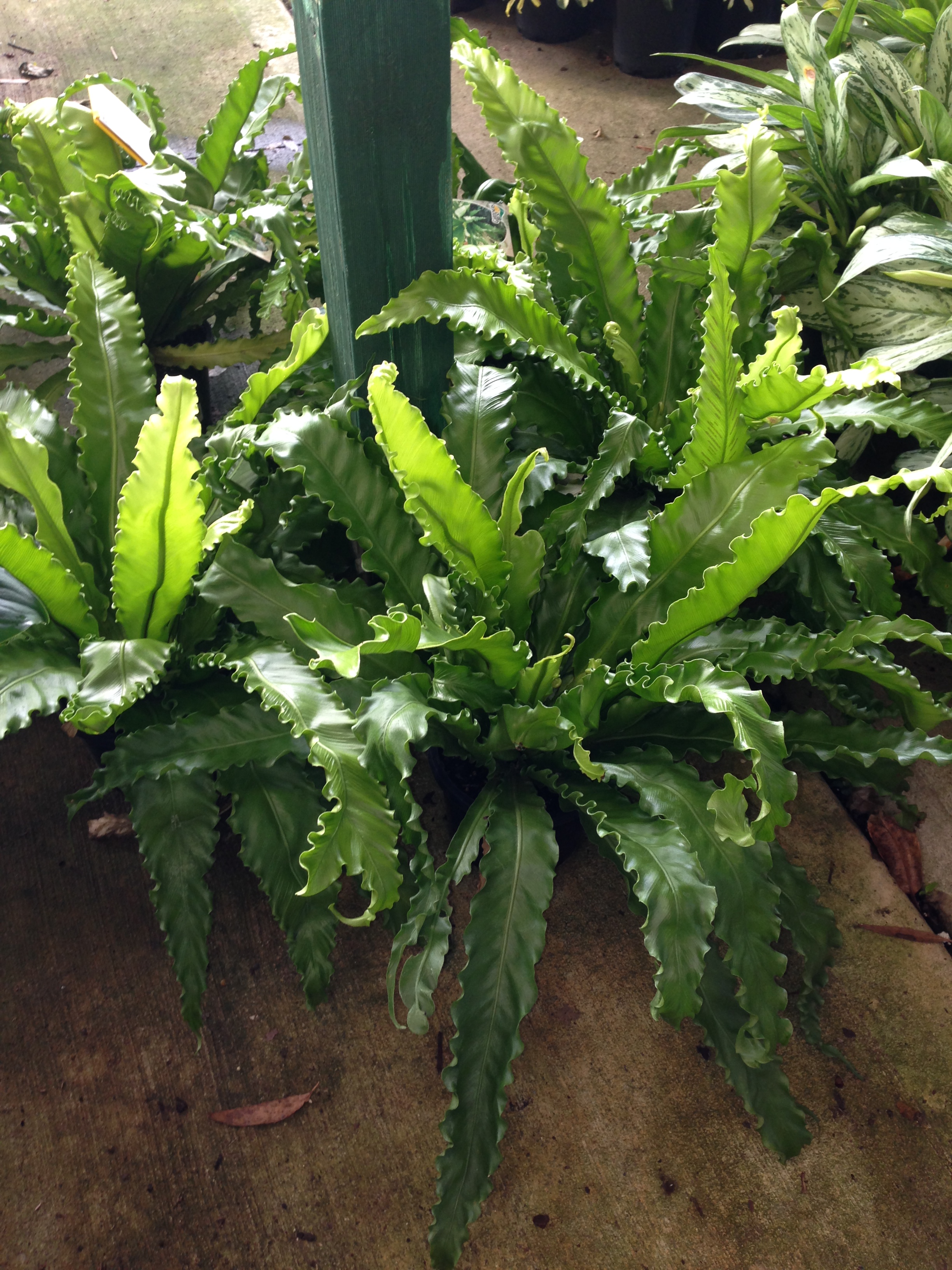 Bird’s Nest fern is quite different with wide, shiny, undivided fronds.  However, the shape or form is similar and combined they are the perfect mix of fit and contrast.  Bird’s Nest fern is epiphytic, meaning that it collects nutrients (fallen leaf matter) and water from above, holds it in the crown and can live in the nooks of trees without any soil to speak of.  There are also some spectacular cultivars available with twists and curls and stunning shaped leaves.
