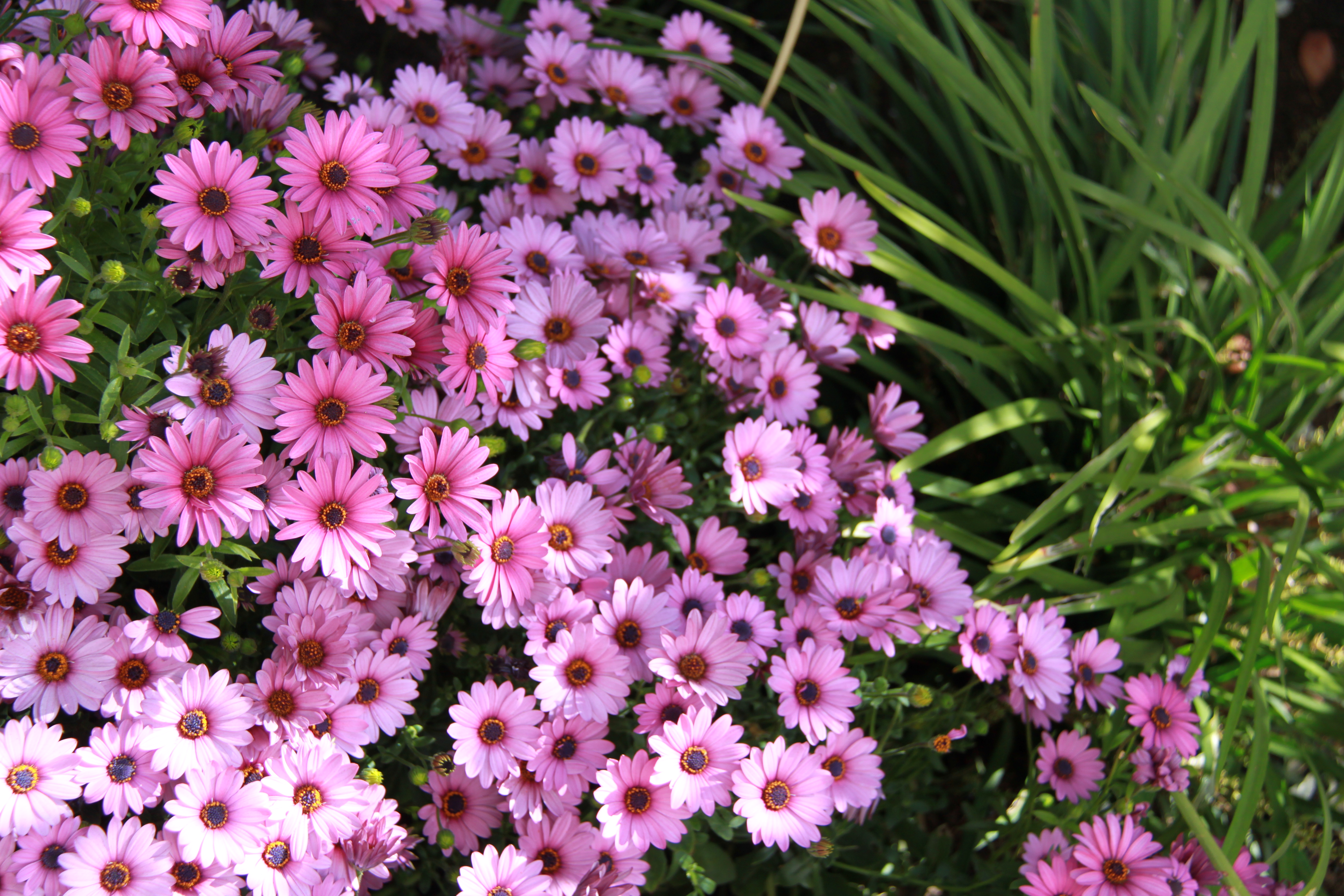 Osteospermum flowering in a shady position, next to Liriope. The white Osteospermum may be better suited for a repeater plant to avoid over dominance