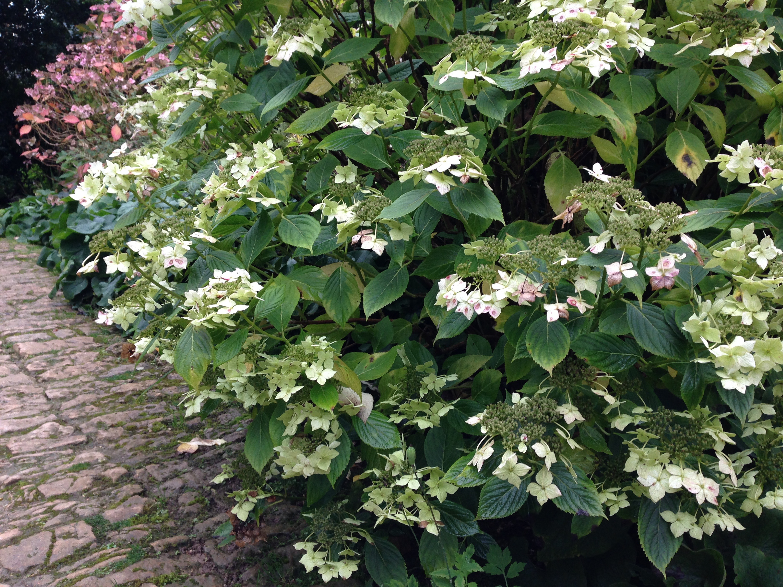 One of a vast number of Hydrangea species and cultivars at Hidcote spilling over the rustic stone pathway