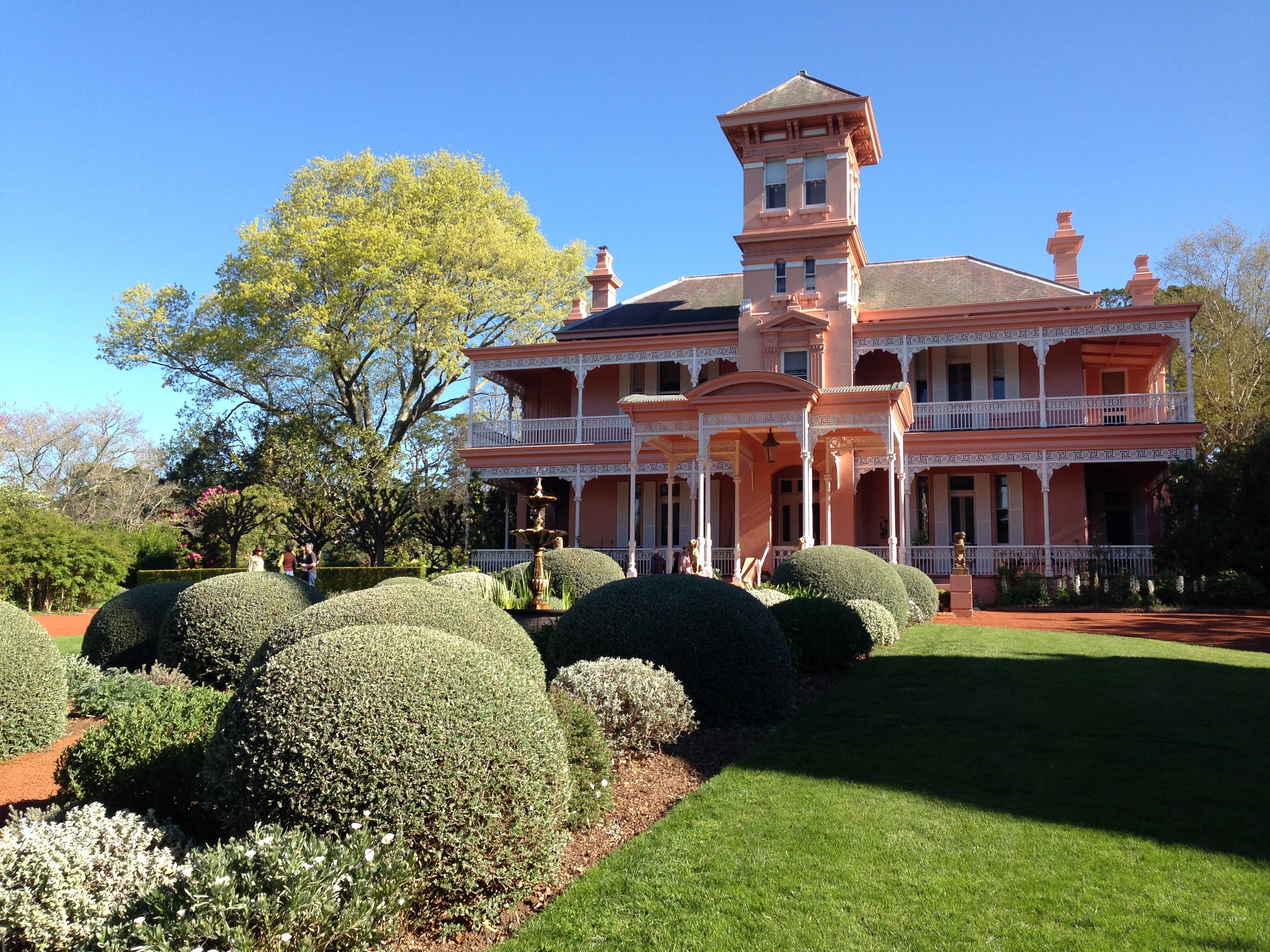 Fountain and topiary balls in front of the house at Retford Park