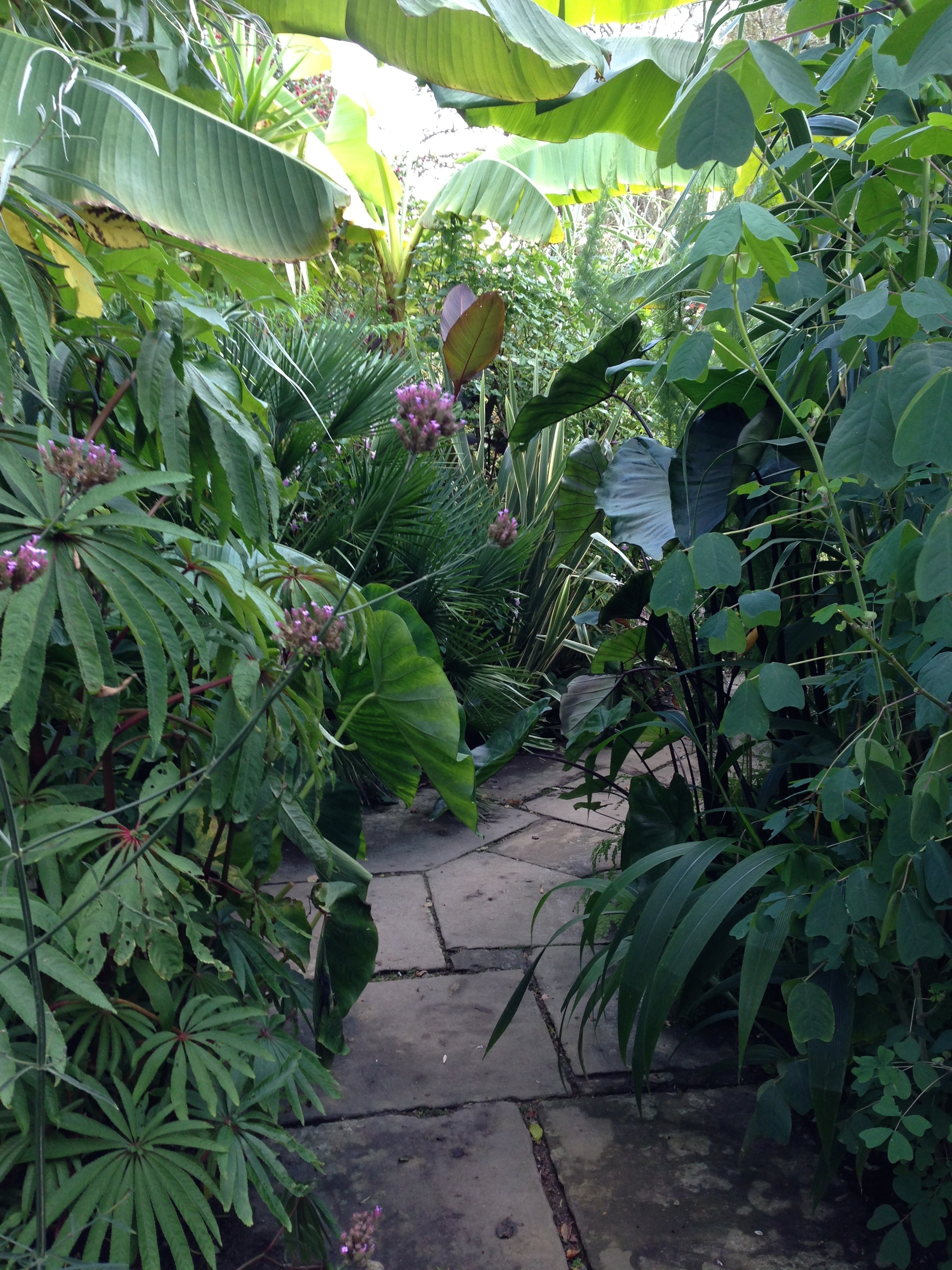 At the time of replanting, a few roses were left in amongst the bananas and gingers and begonias although they have now mostly been swallowed up by the enormous growth of these tropical plants. It genuinely feels like a jungle – tall, overspilling, lush growth surrounds you in all directions; it is quite perplexing to think that you are in the UK.