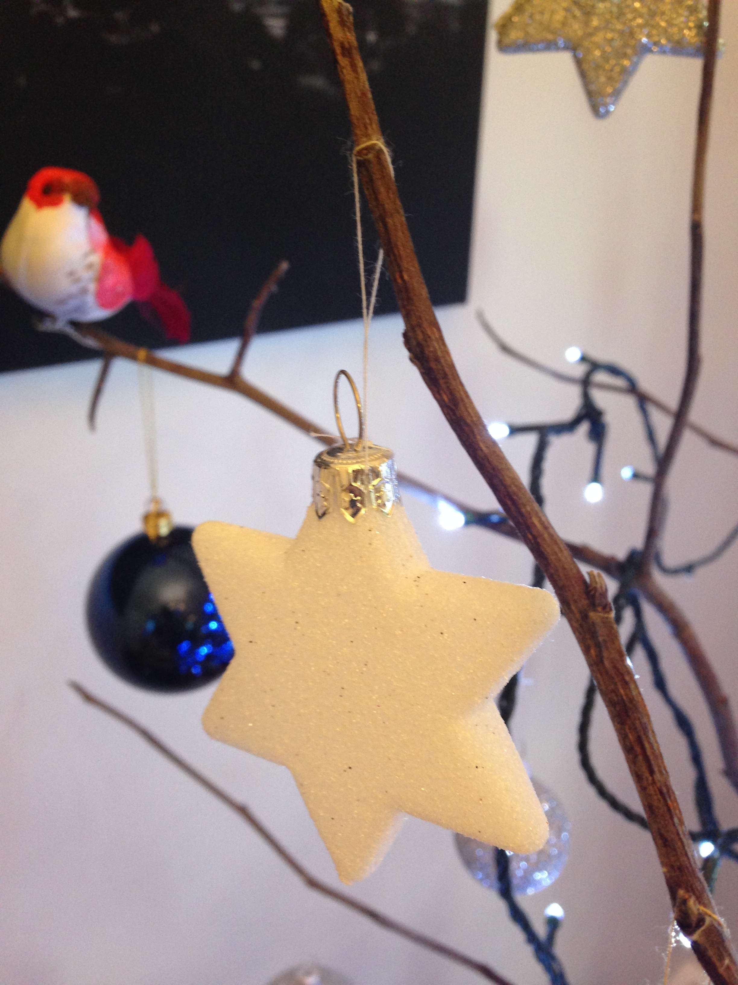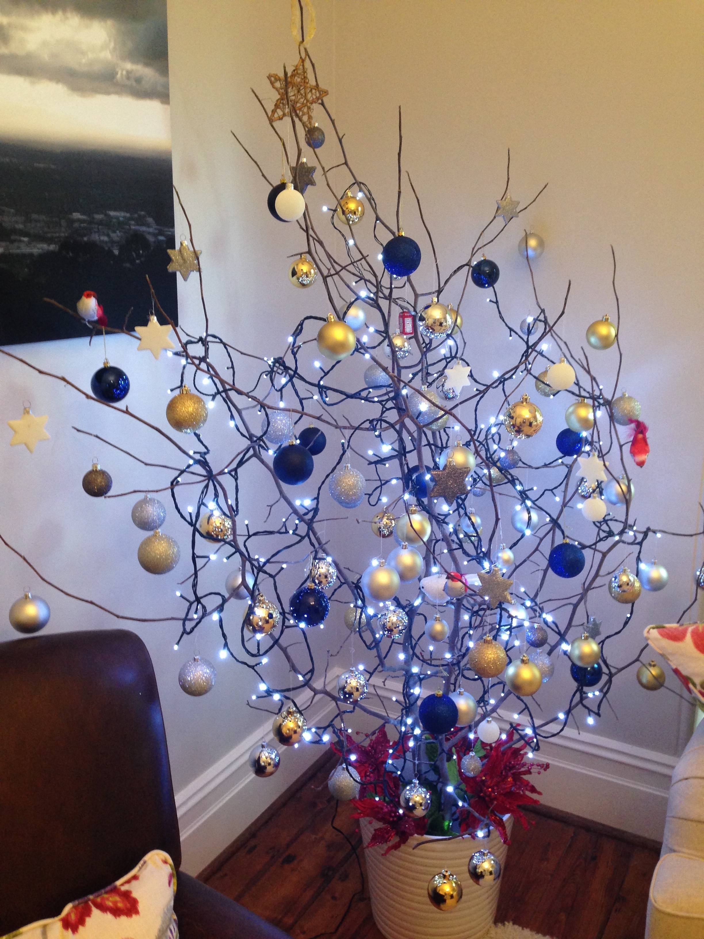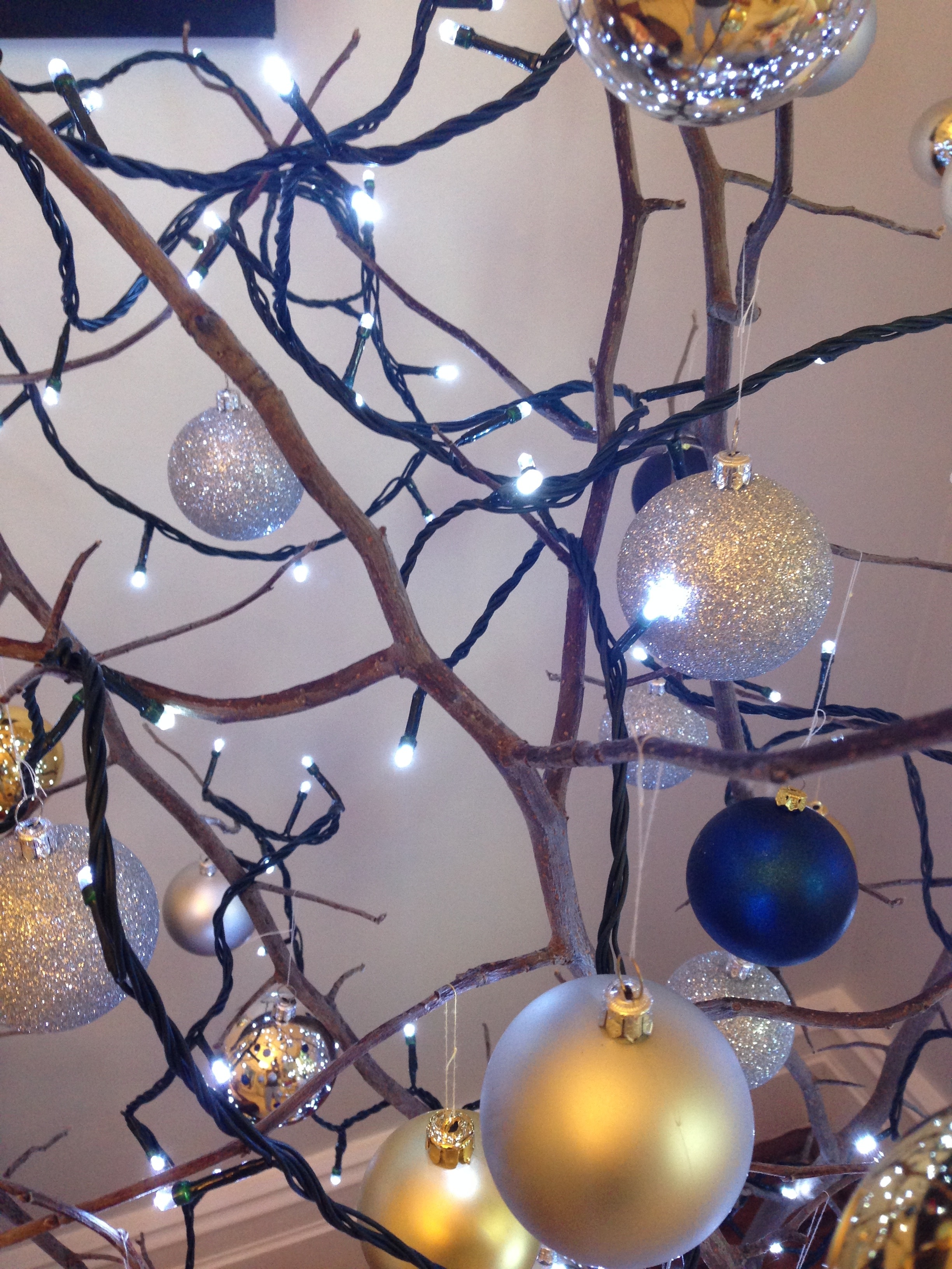 If you can find a crab apple, I’d highly recommend using these branches. You can see that they are highly branched, such that only two stems create quite a large ‘tree’.  This makes it very easy to store  and fix together, with plenty of hanging places for baubles.