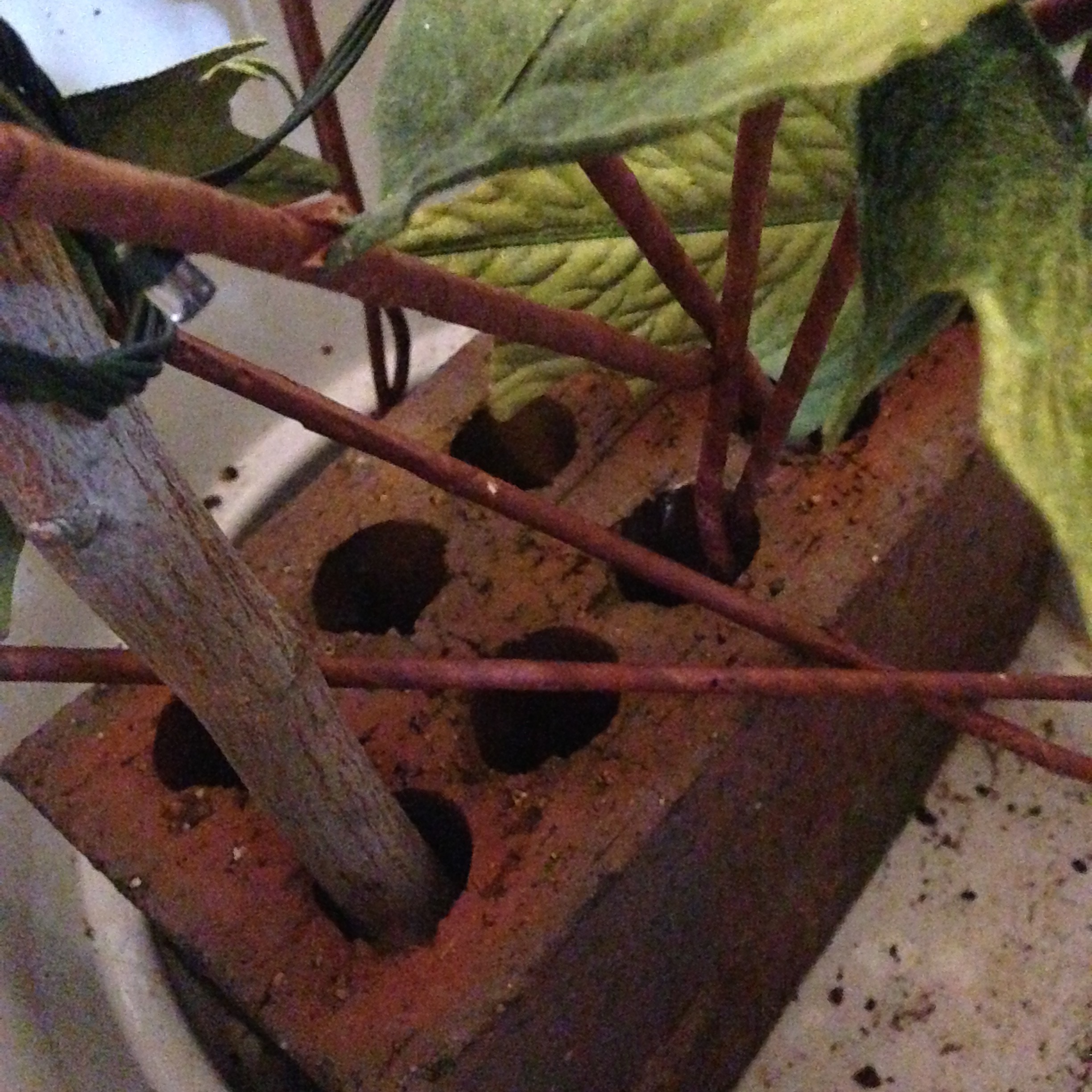 Two engineering bricks, one on top of the other, are all you need to secure your branches (the metal sticks are just the stems of the decorative flowers and in no way part of the structure)