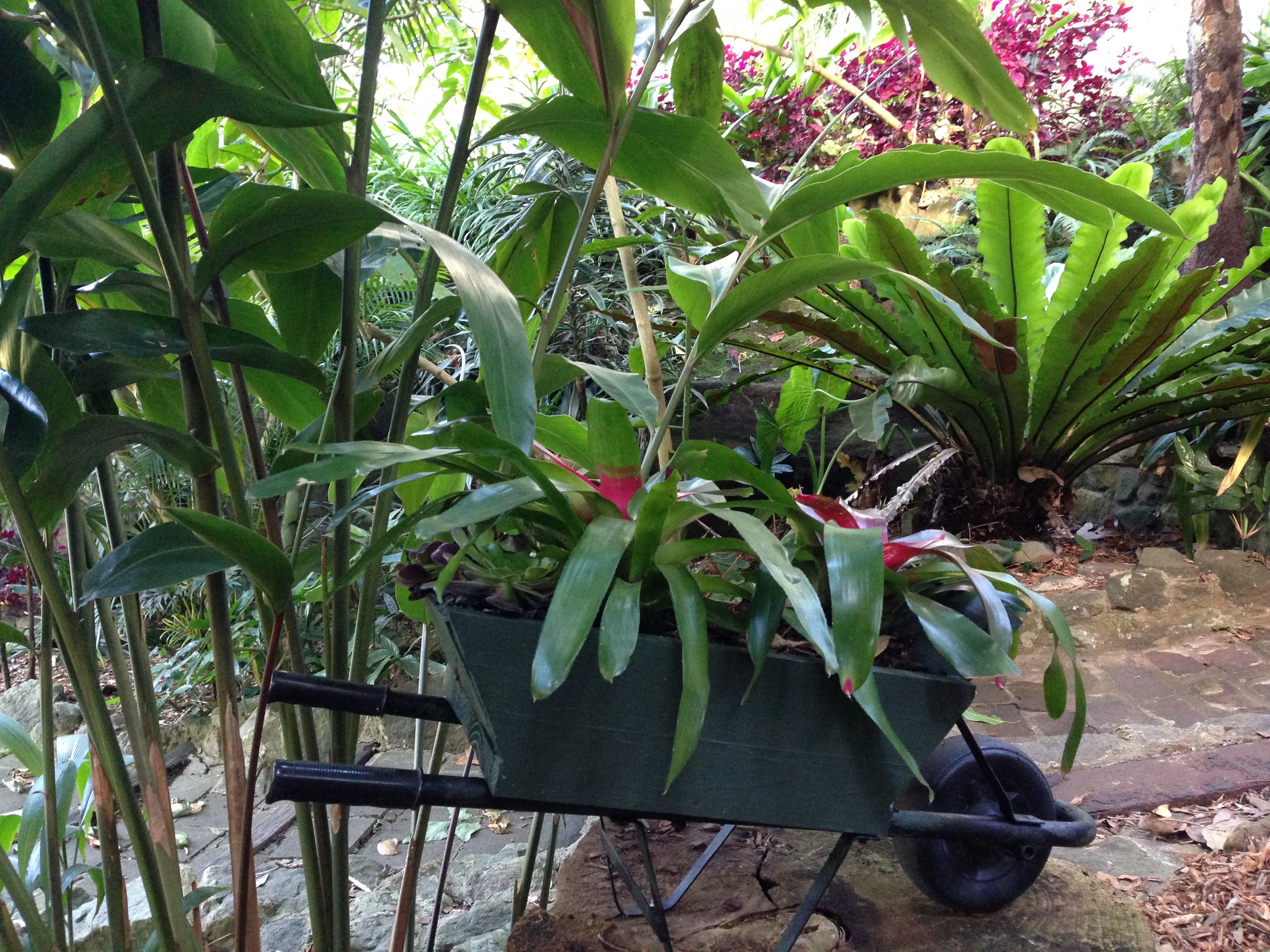 Character is provided by quirky, handmade features in the garden. Little wooden signs with messages carved into them, the sightly wonky handrails formed from tree trunks and the wheelbarrow filled with bromeliads. These, combined with amazing plants and planting combinations make you ooh and ahh at every turn. It is really quite unique.
