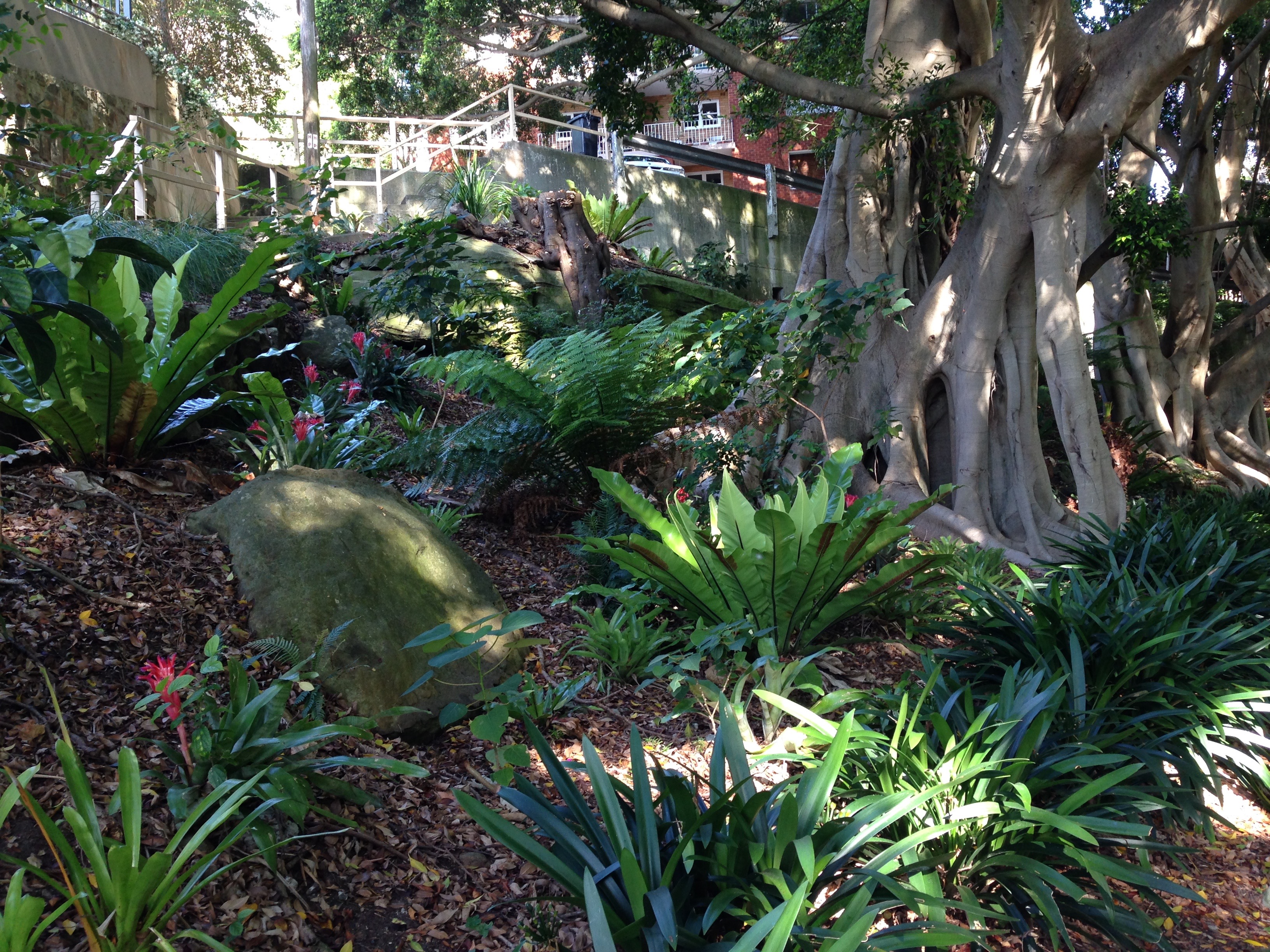 Down the steps as I enter Cremorne Point. Clivia and philodendrons mix with gingers, bananas and ferns