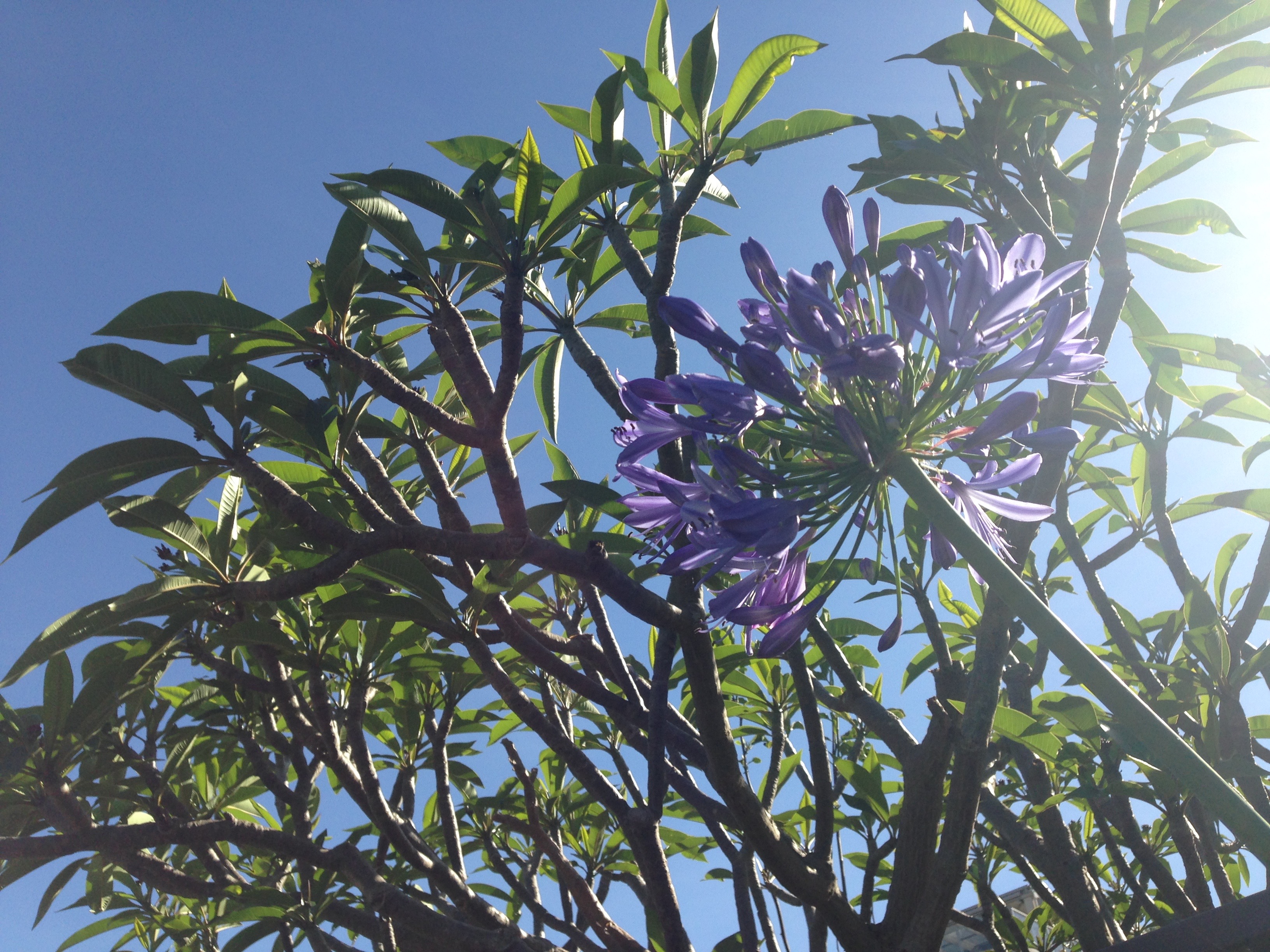 Agapanthus flower in front of a Frangipani tree