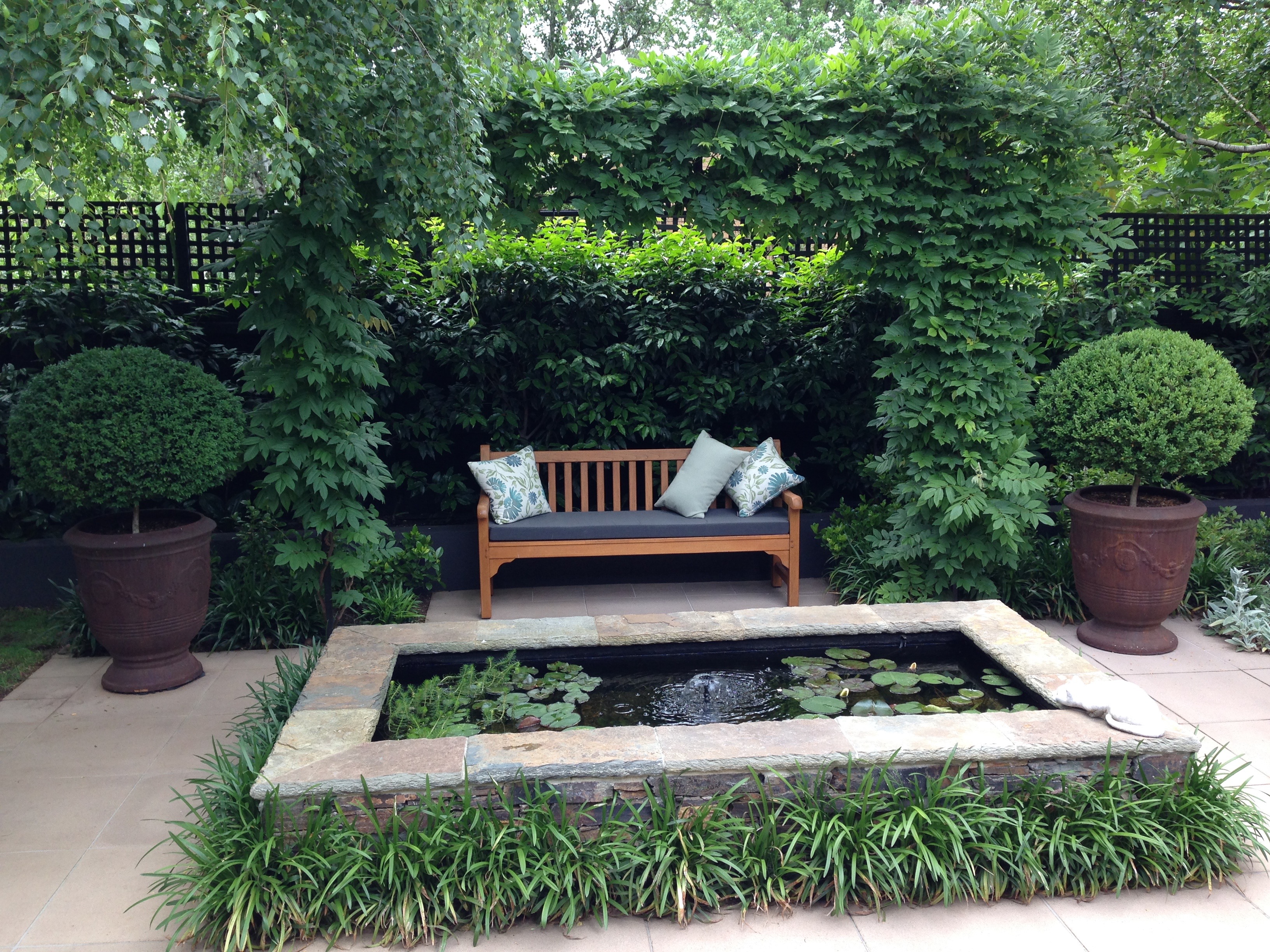 I also adored this cosy seating area at the back of the garden. A shady bench under a natural canopy of leaves, a stocked pond giving movement and life and complete privacy all around – a perfect little oasis.
