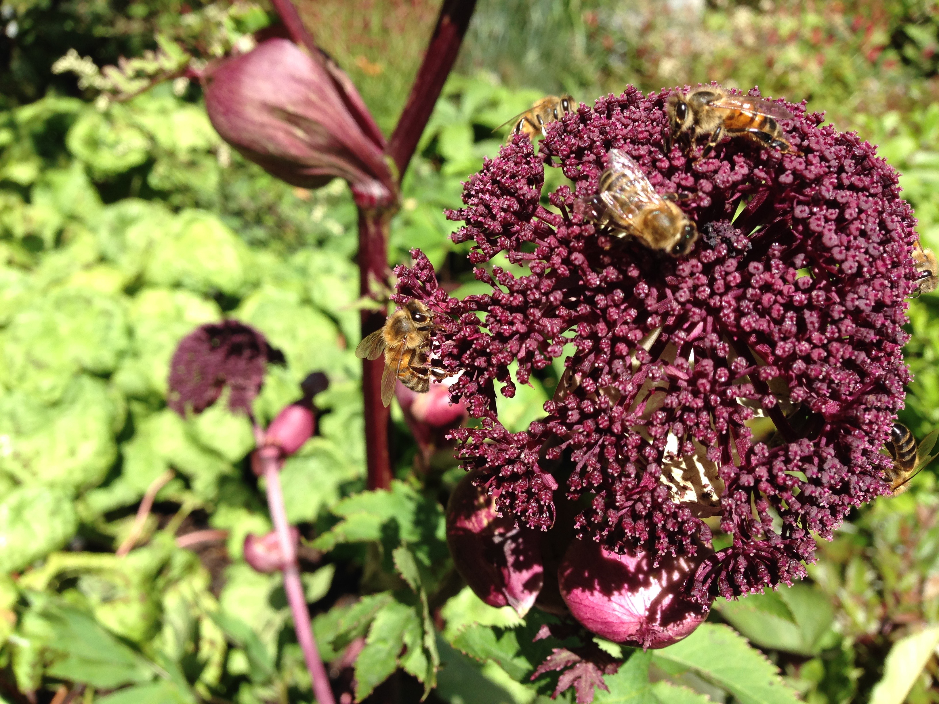 Bees swarm over Ian Barker's Angelica gigas at MIFGS. Janna Schreier