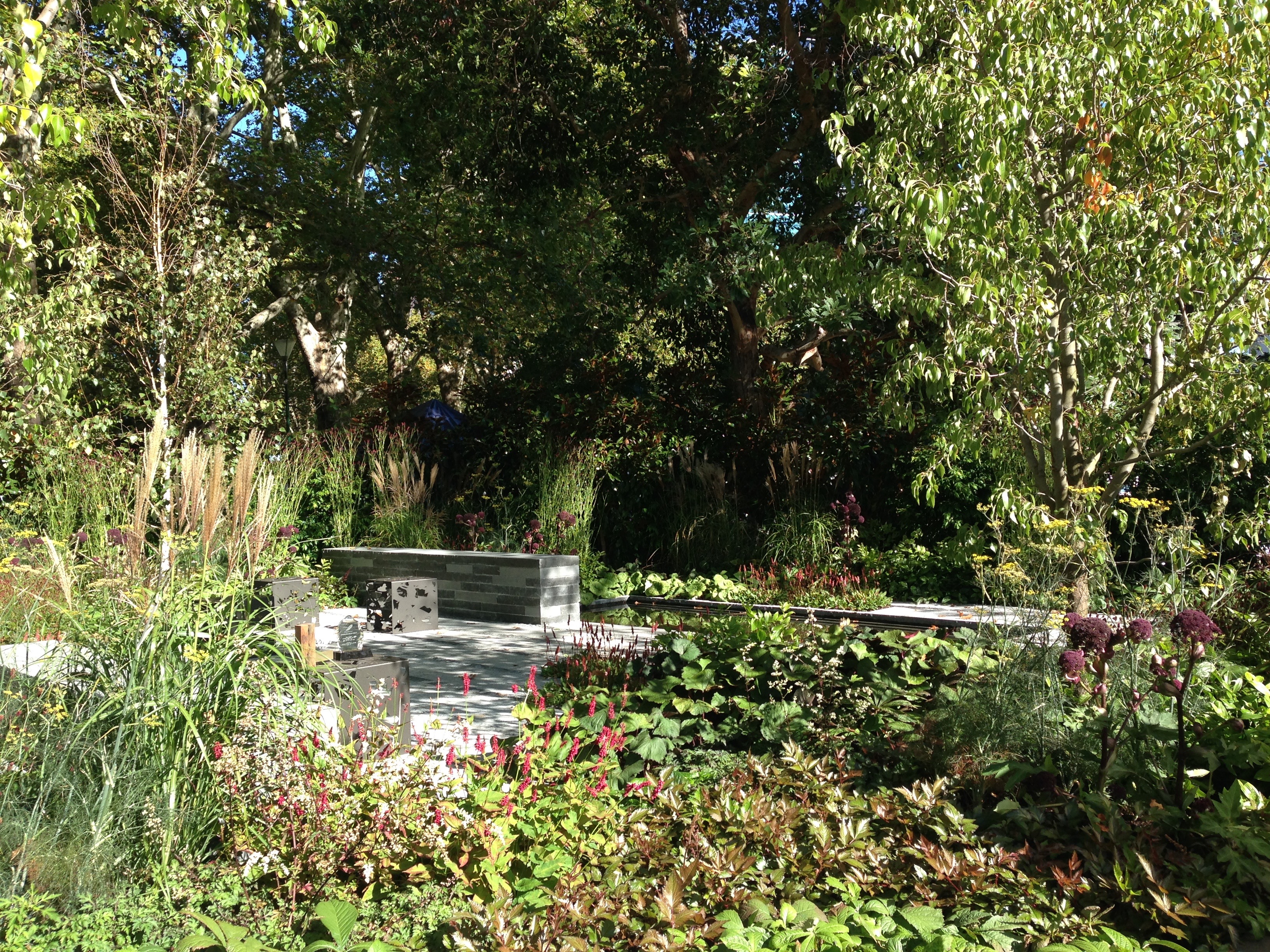 Catherine Stewart’s review of this garden noted an apparent criticism by one of the judges, of a lack of focal point. Whilst I don’t think all gardens need striking focal points, I do wonder if small gardens need more planting structure than larger ones, something to create rhythm as your eyes move around; true vistas and a sense of scale being out of reach.  Tightly pruned Buxus is a common, if now somewhat tedious solution to this, but it could be anything that adds definition. Even stronger vertical elements could have done it, but somehow the small bursts of Miscanthus grasses are too weak for this role.