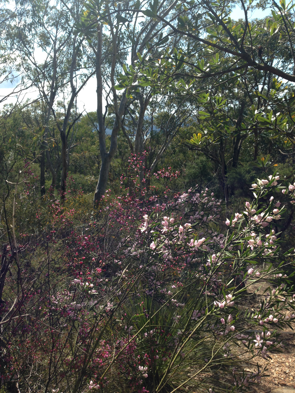 Twisted gums and delicate, pink Philotheca at Muogamarra. The pink of the flowers and grey of the bark is an unusual planting colour palette but it looked absolutely stunning