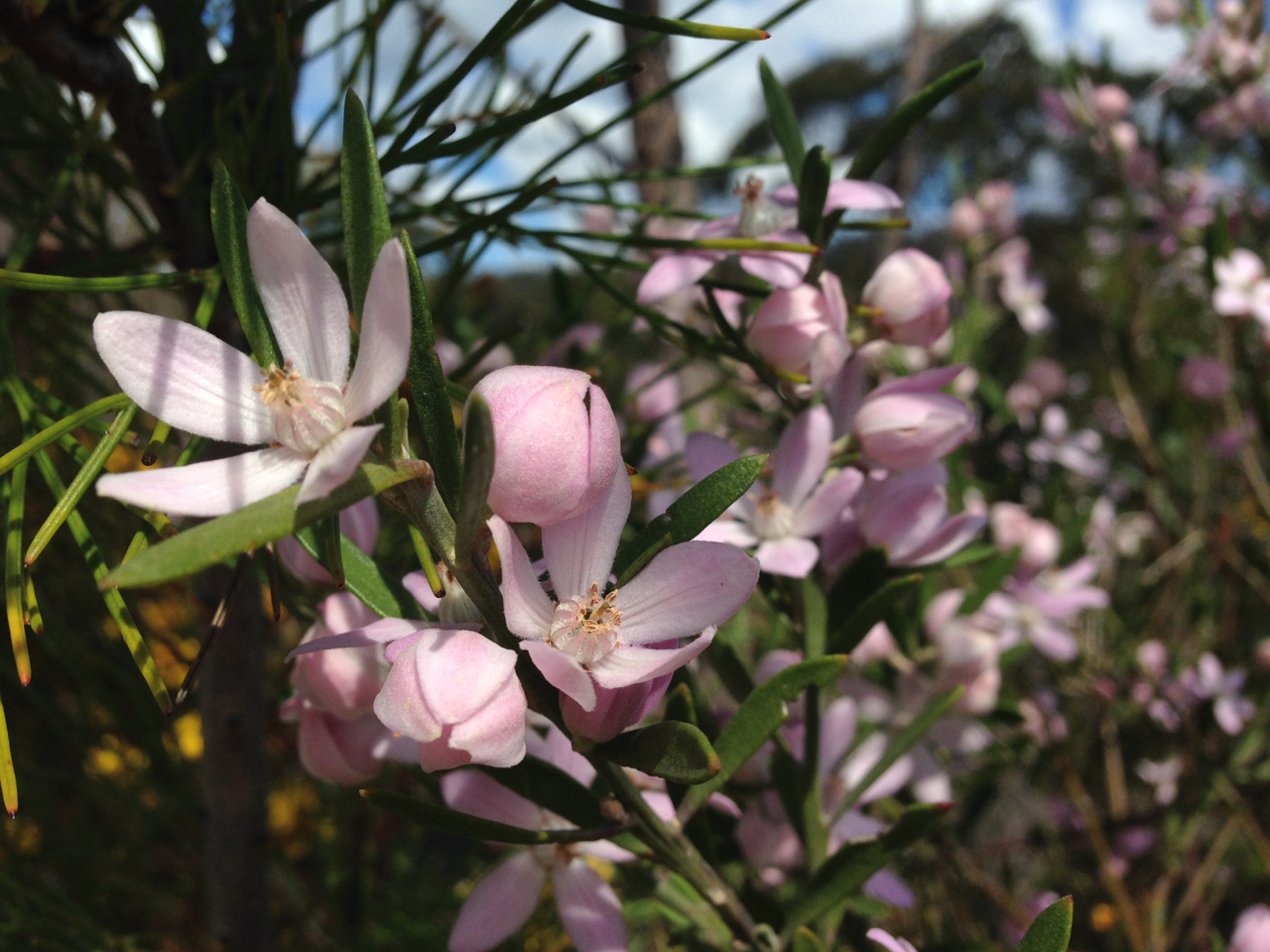 Philotheca australasius and Boronia ledifolia with a backdrop of Banksia and gums at Muogamarra Nature Reserve