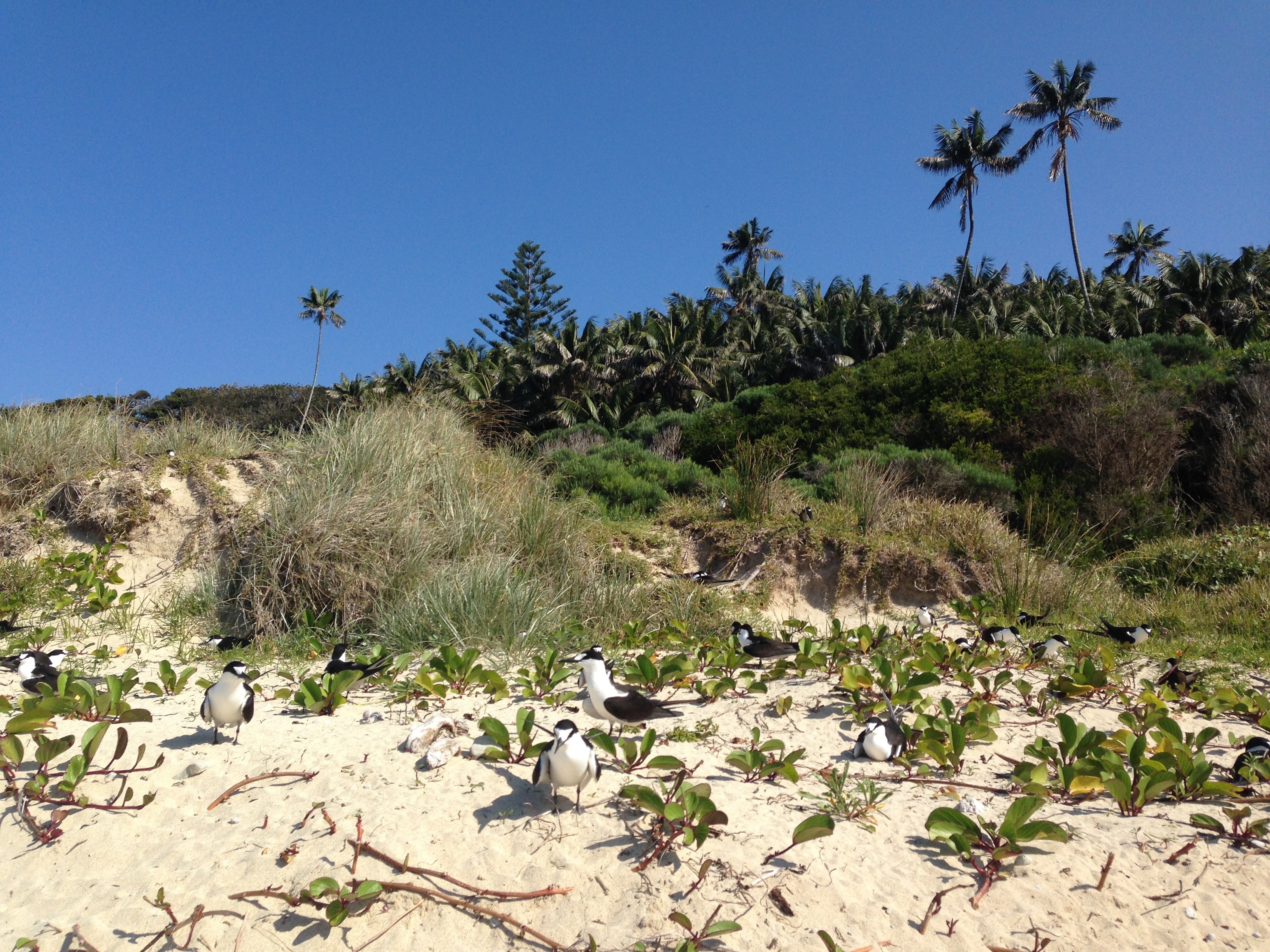 Sooty terns were nesting on the beach; perfect, duck egg blue speckled eggs were revealed when the birds flew off to feed