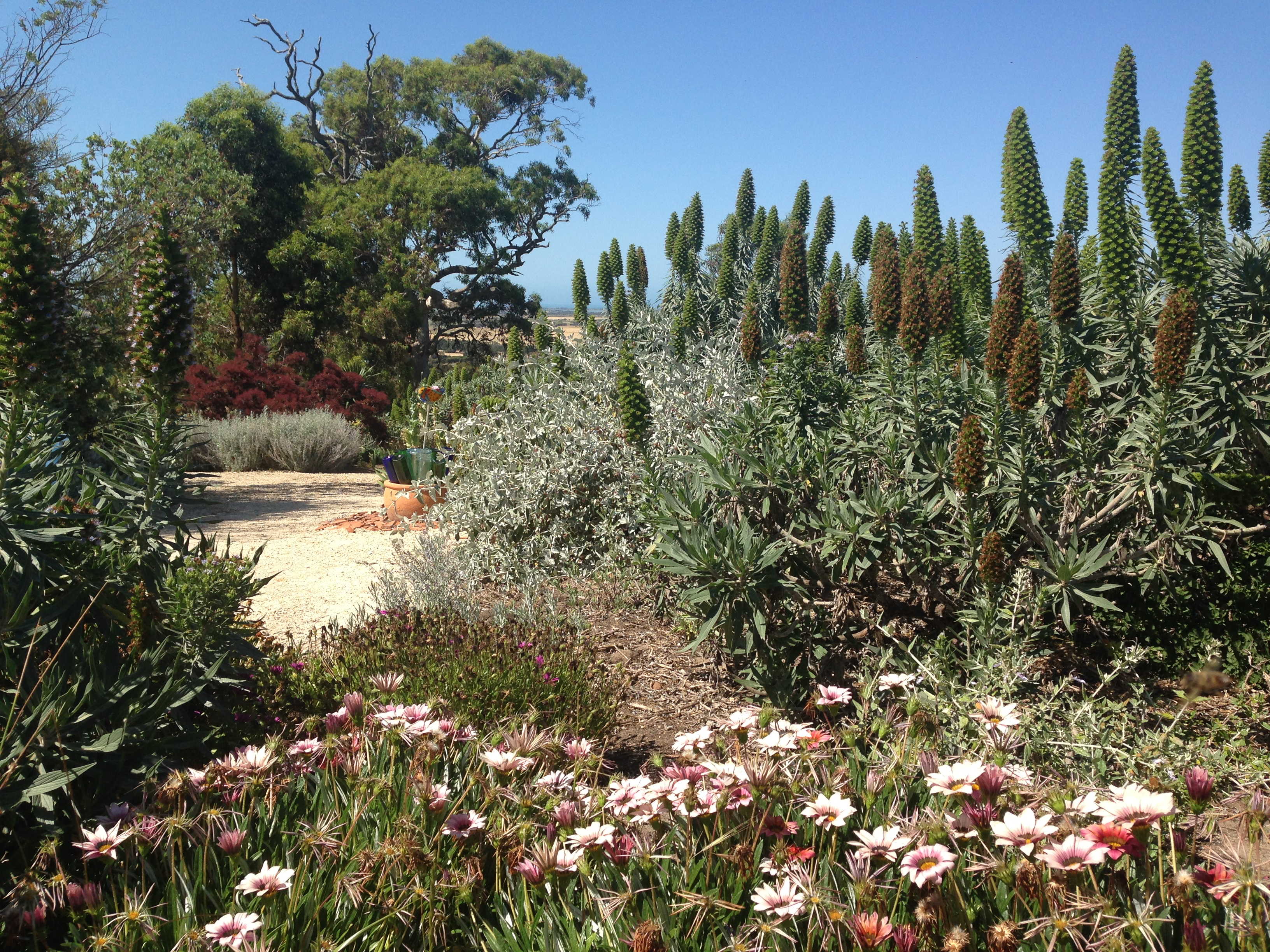 By selecting plants with the base colour palette of the surrounding landscape and retaining the subgroup that thrive, Sarah’s plants, Australian or not, appear perfectly at ease in their setting. They meld into the distance, seemingly extending the garden’s boundary for miles out to the ocean. As the winter rains arrive, the fields and the garden green up. During the hot summer, the fields and the garden brown off, both perfectly in sync with each other.