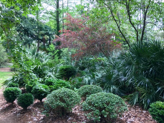 A slightly more formal area at Peckerwood Garden, with contrasts in foliage colour and form