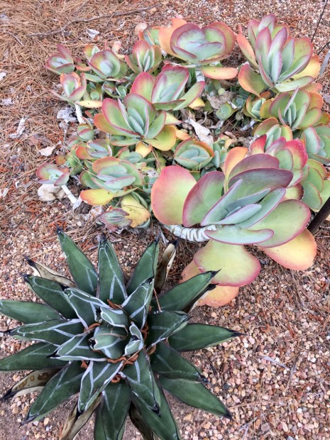 Kalanchoe tetraphylla (paddle plant) and Agave ferdinandi-regis (king of the agaves) provide great contrast in the gravel garden at Peckerwood
