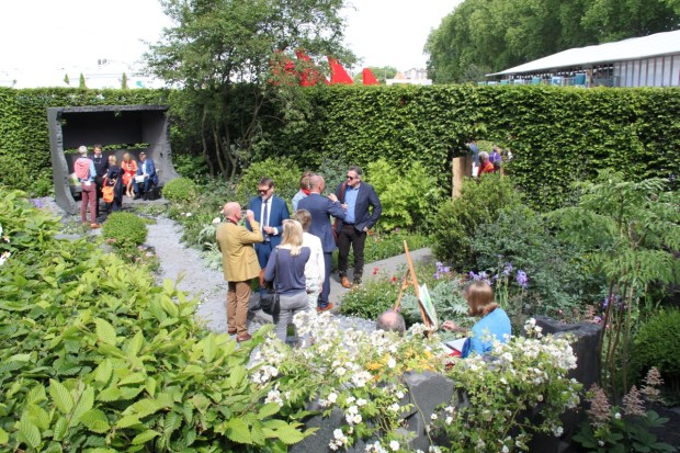 Darren Hawkes’ was the first of these gardens. Most seemed to completely miss it first time around; it’s hidden behind a nine foot high hedge. But a small pathway takes you up and behind the garden, to look out over it from above. It was beautifully done, even the pathway edge had roses rambling through the hedgerow and by 10am champagne was flowing and all the good and the great from the gardening world (including Andy Sturgeon, Chelsea’s 2016 Best in Show designer, and Matthew Wilson who designed this same plot last year) seemed to be having a party there with Darren.