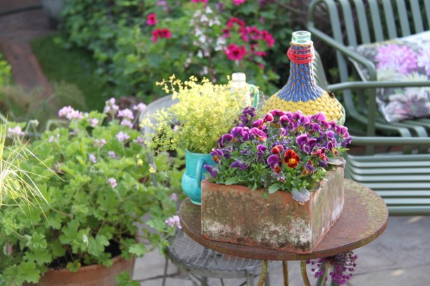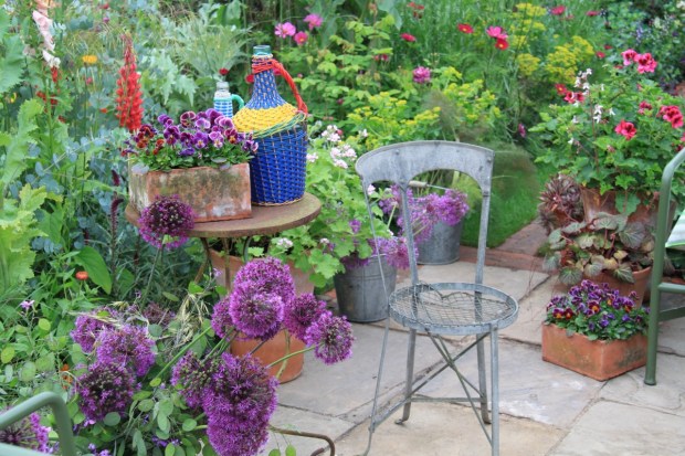The attention to detail in every square inch surpassed every other garden. Just look inside the battered old shed and you’ll see enormous numbers of little bud vases lining every shelf. Look at the little trinkets in the seating area, the watering can, the skinny brick wheelbarrow paths and the repurposed plant pots.