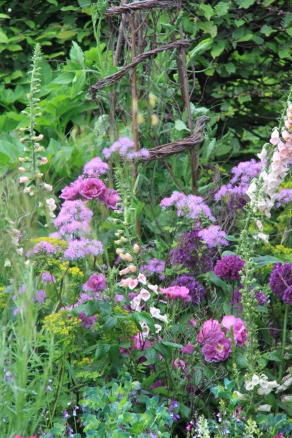 Ageratum and roses, foxgloves and allium all nestle in together around this natural-style obelisk