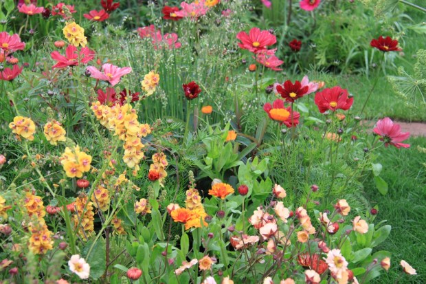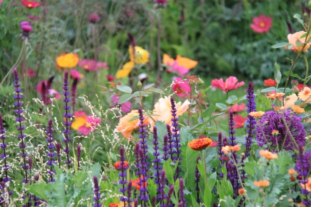 I love the ‘clashing’ colours, which didn’t clash at all to my mind and I loved the moments of respite in calmer blues and greens. I loved the natural stakes and the feeling of letting the plants pretty much find their own way, spilling out as they wished over the grass. I loved the (totally impractical) Eucalyptus providing calming and beautiful structure to the beds and I adored the fact that the whole garden was unbelievably full of bees.