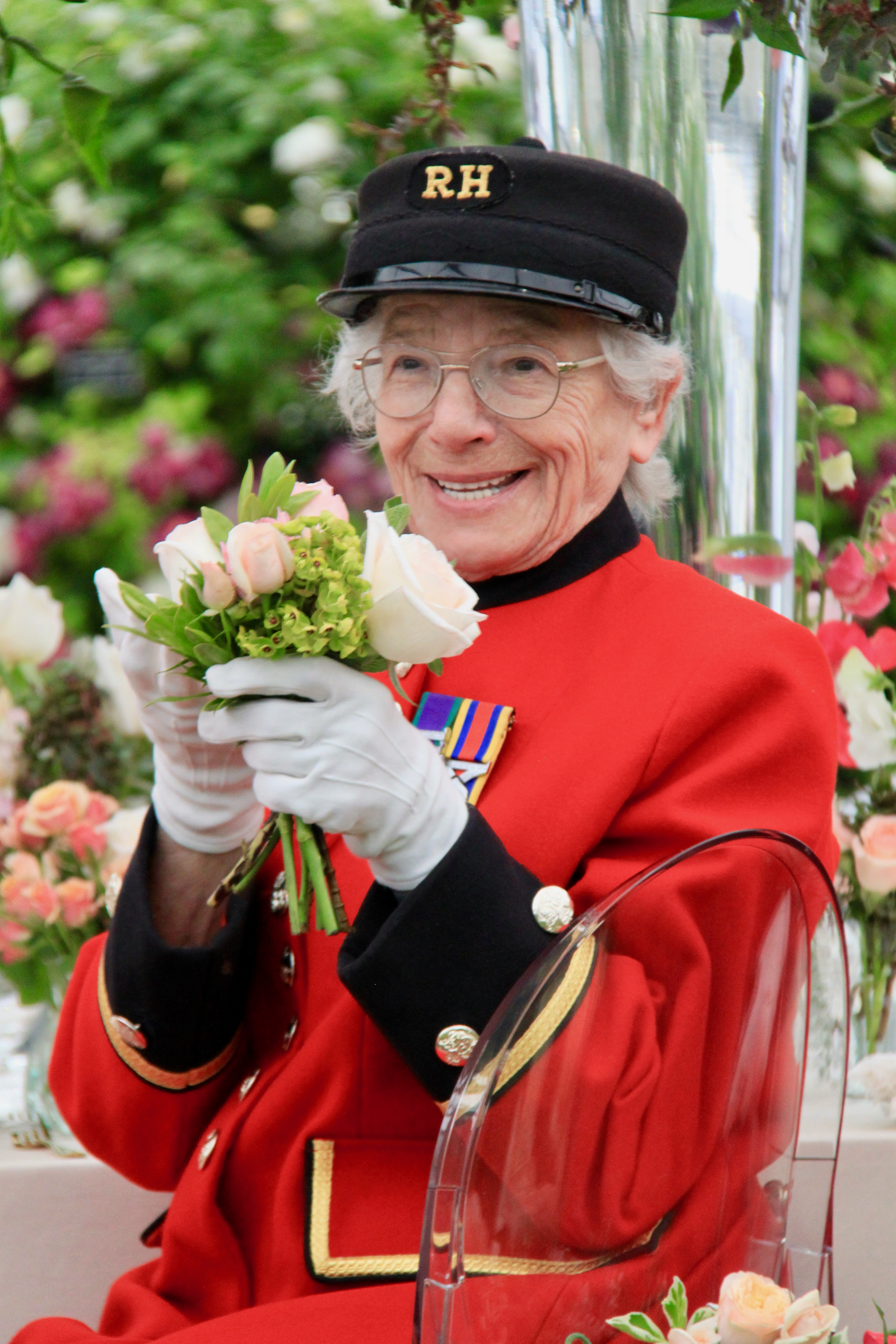 In a similar vein, we were treated to the sight of three female Chelsea Pensioners (of the 13 at the hospital) in their finest red finery, being presented with posies at the Real Flower Company stand. All Pensioners, male or female, have both served in the army and are single or now widowed. As the glamorous lady in the photo was presented with her flowers, she turned to me, smiled and said, “always a bridemaid, never a bride”. My hay fever immediately struck up once more.