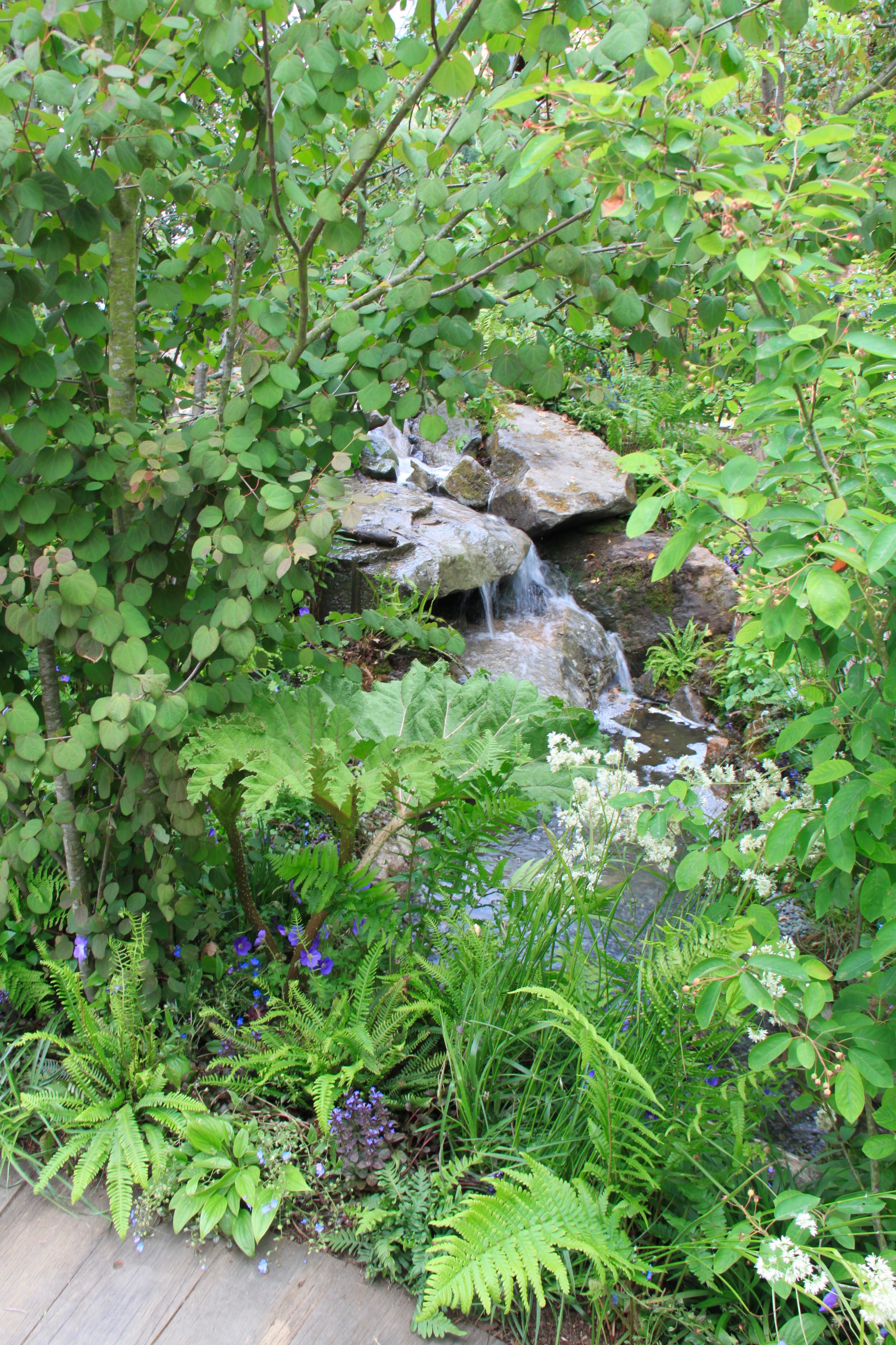 A peak through a gap in the shrubs leads the eye to a waterfall in the RHS garden