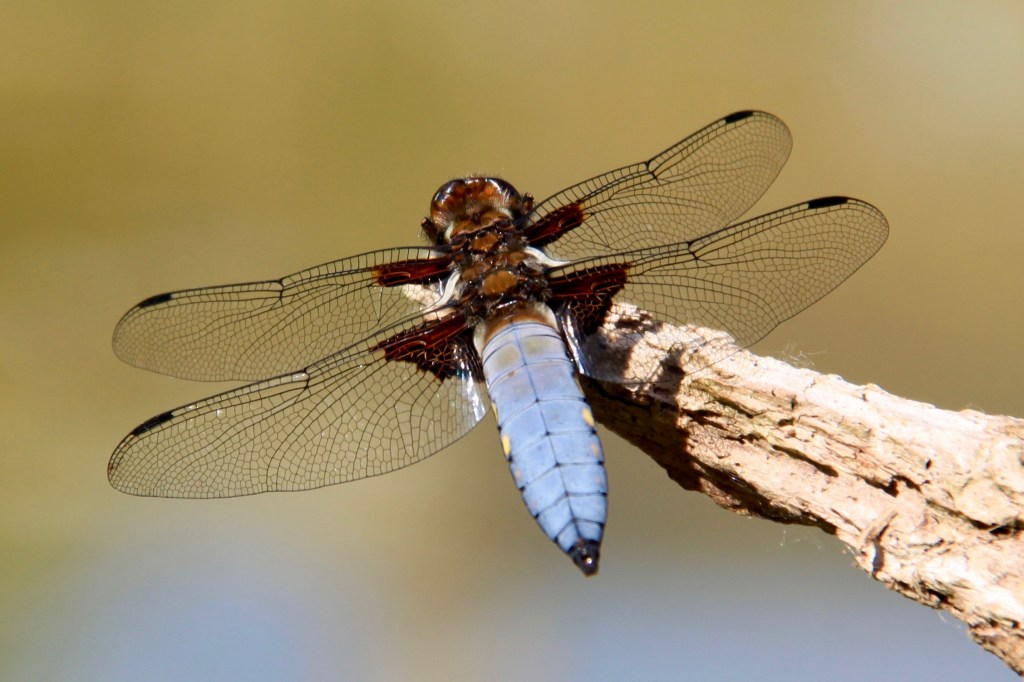 A male broad-bodied chaser dragonfly pausing on an overhanging branch (I also saw elaborate courting, fighting, mating and egg-laying…so there is hope for next year, too)