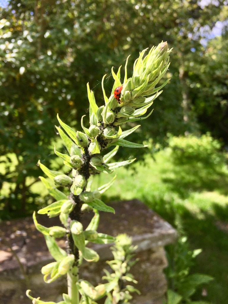 The garden is worryingly dry again this year; thank heavens we haven’t planted huge numbers of plants over the autumn and spring. The foxgloves on the higher, drier ground have significant aphid invasions, but guess what, the ladybirds are there having a feast.