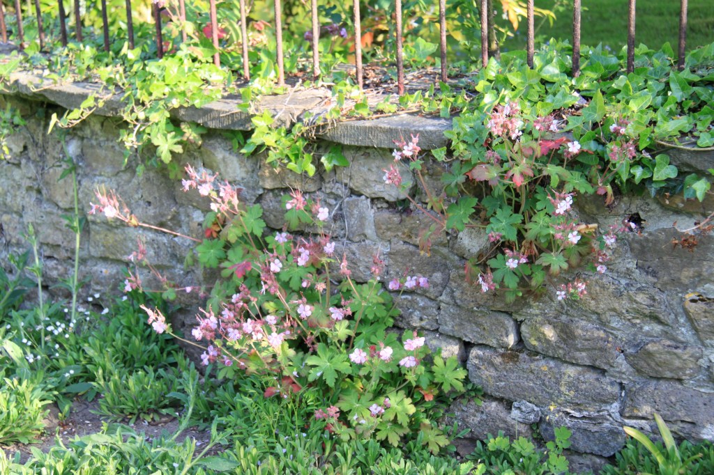A geranium spilling over the old stone walls – previously unseen for nettles and comfrey