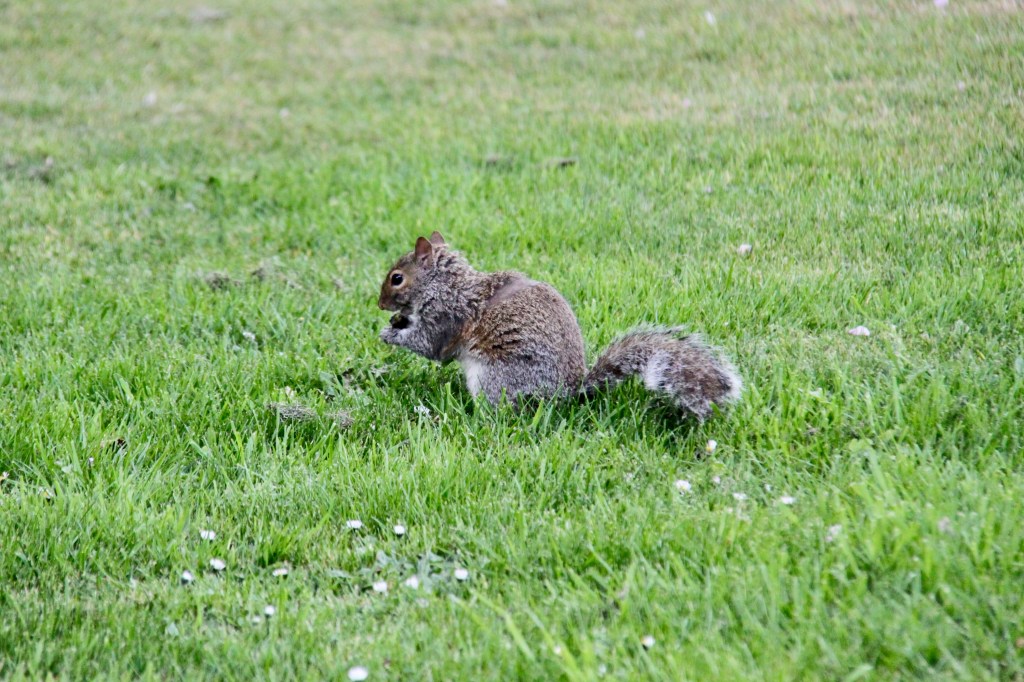 A squirrel running along the path with a heavy load, on his way to re-line the drey…