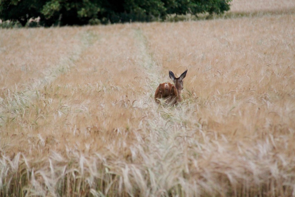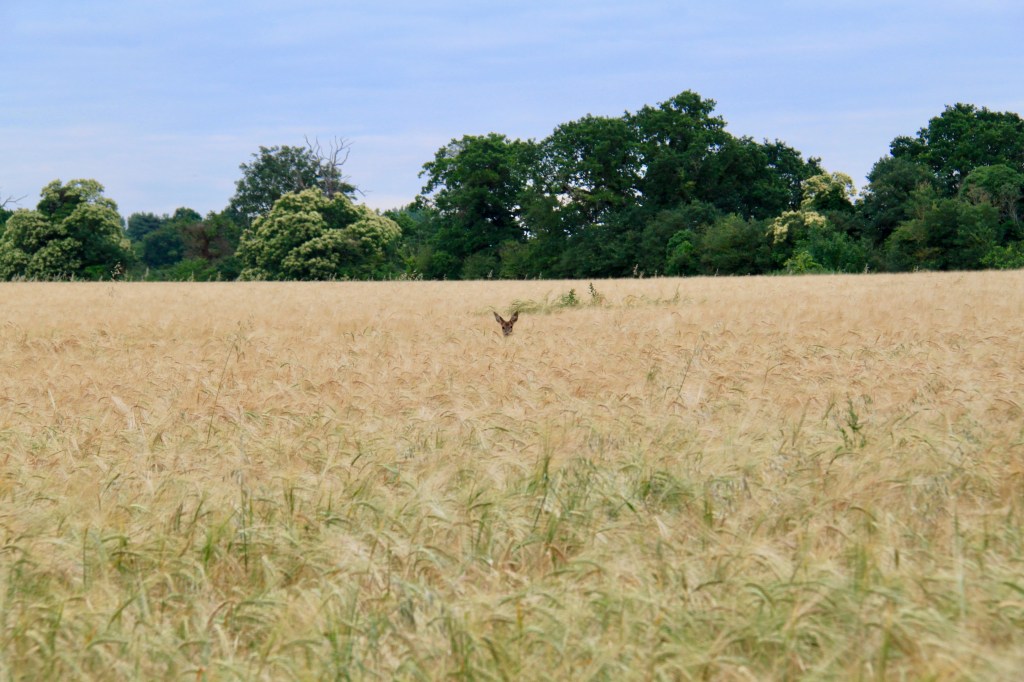 Another day I was gazing out across the field, when I suddenly noticed a small head. Daryletta the deer was standing in the middle of it, presumably having a bite to eat, when we both locked eyes. I’m not sure she thought I could see her and she stood quite still for some time. I naughtily moved a little closer along the track until she decided enough was enough and off she sprang too, her knees up high above her bottom.