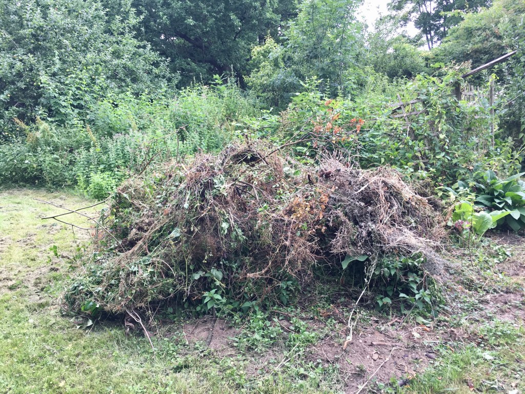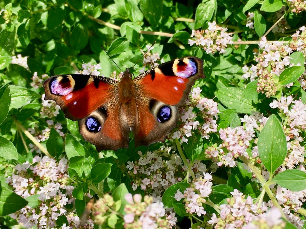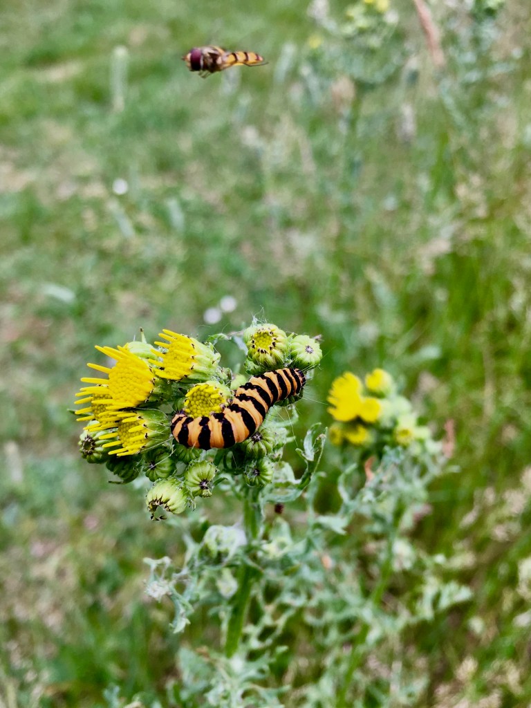 With the nettles broadly under control, not only have the wildflowers germinated and blossomed in their new found space, but with them have come the insects. Butterflies swoop up and down between flower stems, congregating in the muddy shallows of the pond to drink on a hot day. The sound of bees is often quite deafening; where were they all that first year? Aphids no longer hang around long on the roses, hoverflies and ladybirds ensuring they are all munched up and completing the circle commenced in May, the cinnabar caterpillars are out there currently devouring the ragwort.