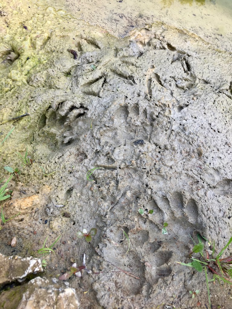 It’s not only the butterflies that come to the pond to drink. In the record breakingly-hot weather this month, an incredible collection of footprints have appeared above the lowering water line. I couldn’t work out the almost cartoon-like rounded footprints bottom right of the photo, until our wildlife camera picked up a new animal for the very first time.