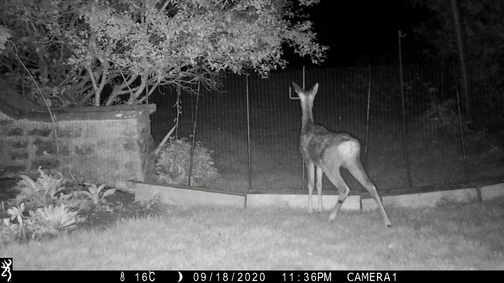 I’ve also put a temporary fence up along (supposedly) the last line of attack into the orchard. Whilst all was quiet during the day, having realised – with the help of our trail camera – quite how many animals were sneaking past the house in the dead of night, a fence by the back door became high up on the to do list.