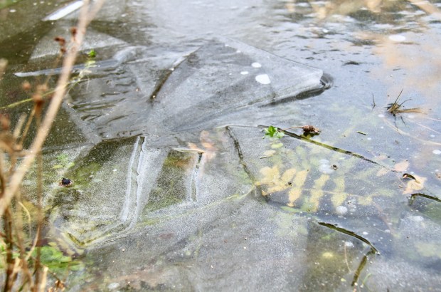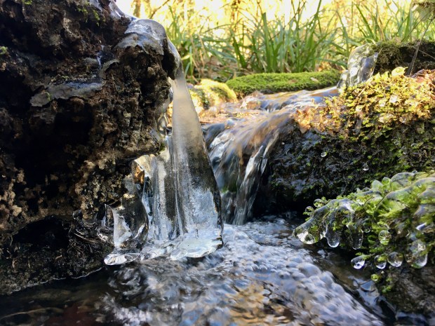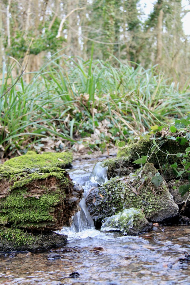 The pond freezing over is quite normal, although the icy patterns were something new, as was the depth to which it solidified this year. But parts of the stream actually froze this month; little icicles forming along its meandering path.