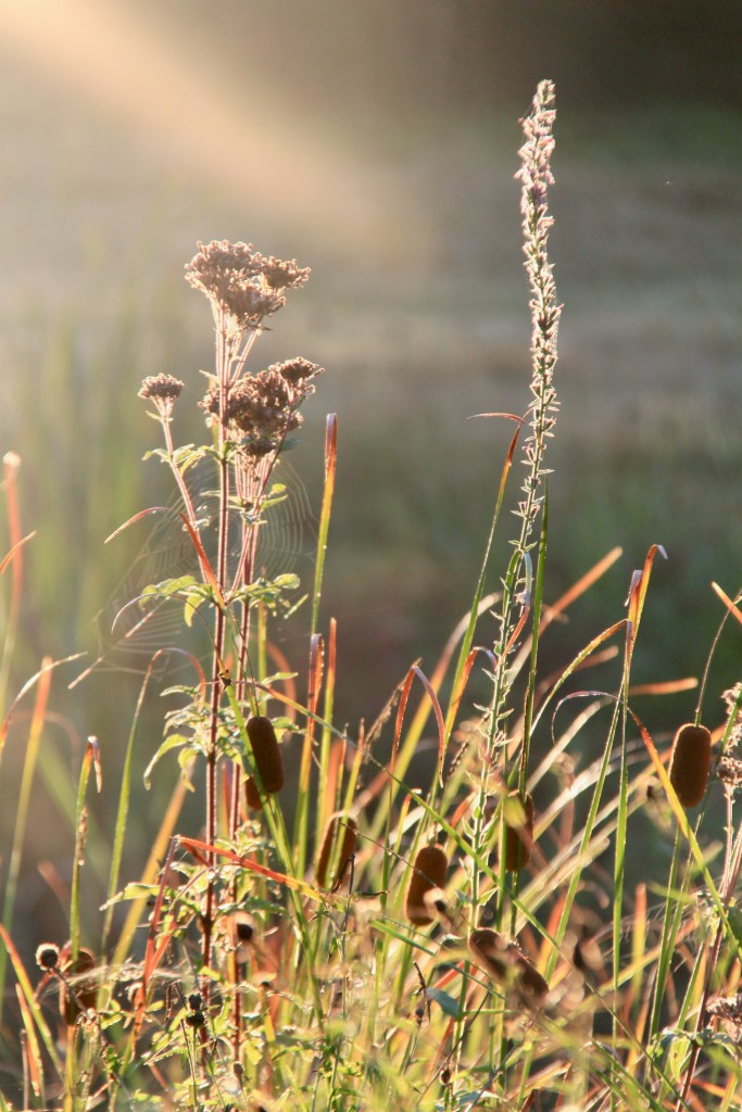 The weeds have disappeared. The rays of light reflecting tiny droplets of moisture in the air, on the ground, are all the eyes see. The silhouettes of grasses and seed heads backlit as the sun finds a new path. Gradually embracing the whole garden as it rises higher in the sky.