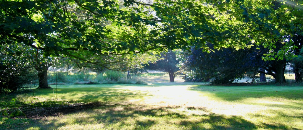 The low sun on the horizon draws long lines on the lawn as it feels its way through the trees, appearing here, then there, like a highlighter picking out specific points of interest.
