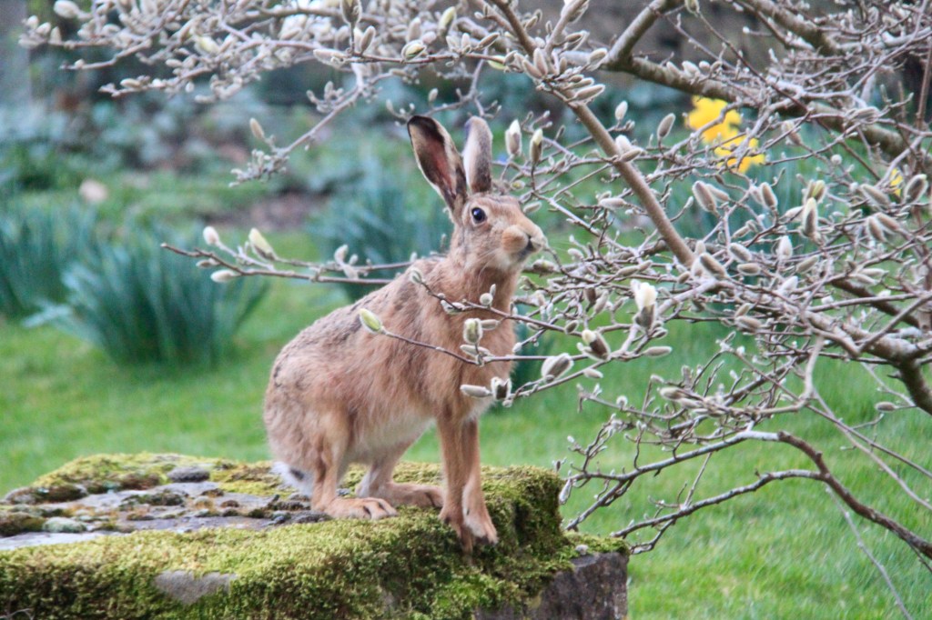 Oh dear, that sounds a bit traumatic. A nibble on the odd leaf is a bit different to chopping lovely saplings in half. We love the hares and blame nothing on them! They don’t dig, of course, and seem to mostly just mow the grass for us. I have had one young oak severed at ground level and blamed the rabbits for that, but who knows? I now put tree guards up, which seem to work. Fingers crossed! Katherine said her hellebores and snowflakes are all out – oh to pop and see them!