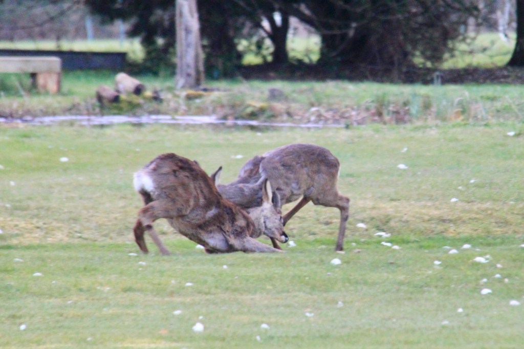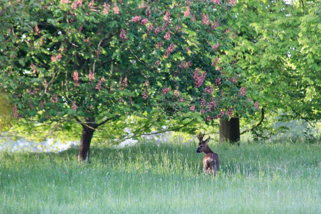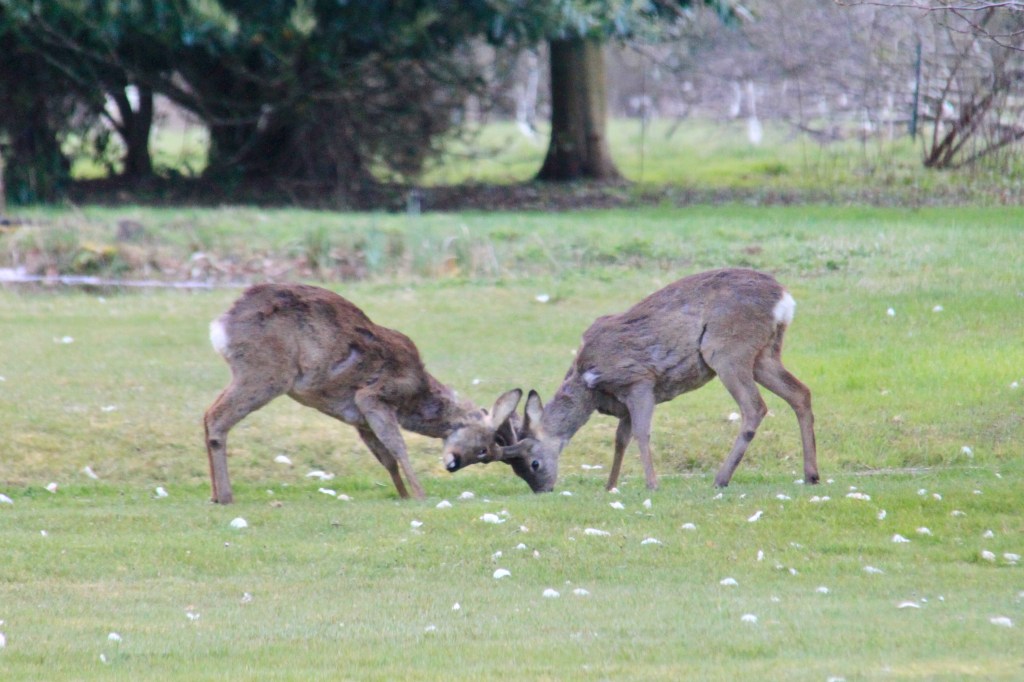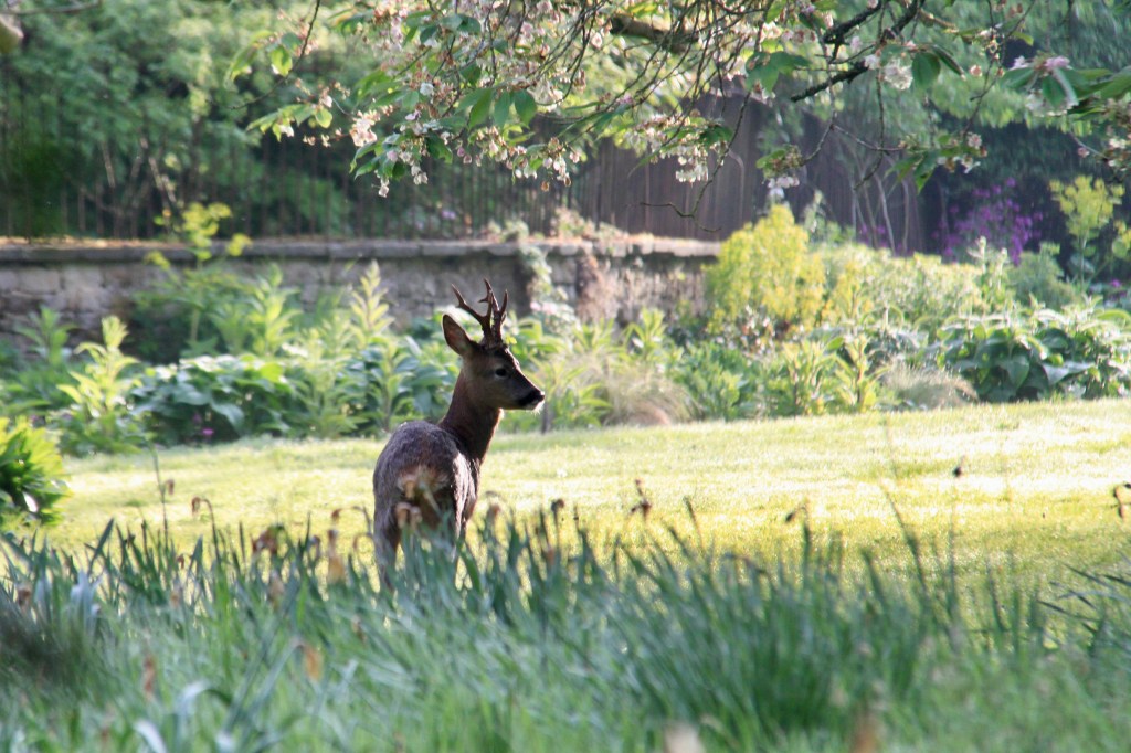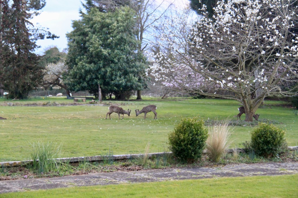 Spring is the time for new arrivals. Baby hares, or leverets, appear by the cedar of Lebanon, little bunnies play on the top lawn and beyond, there is a field full of skipping lambs. The deer are fighting it out for territory over the coming season, in anticipation of their late spring arrivals.