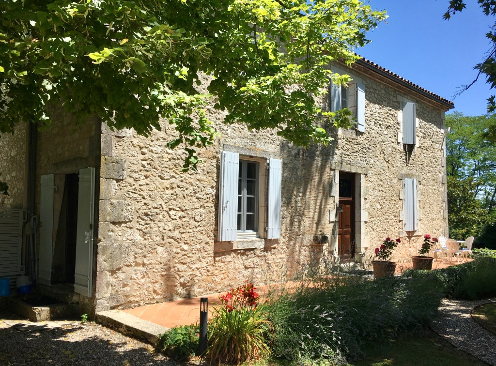 The old, blue-shuttered, stone house a picture of perfection, looking out across farmland to the village church.