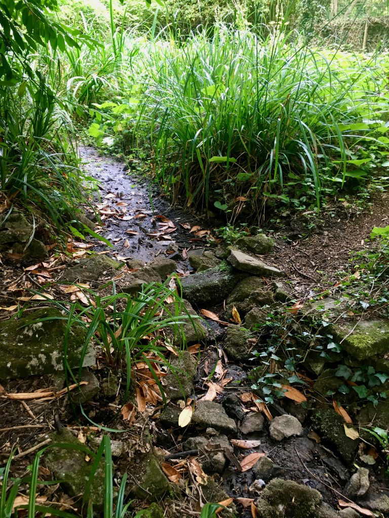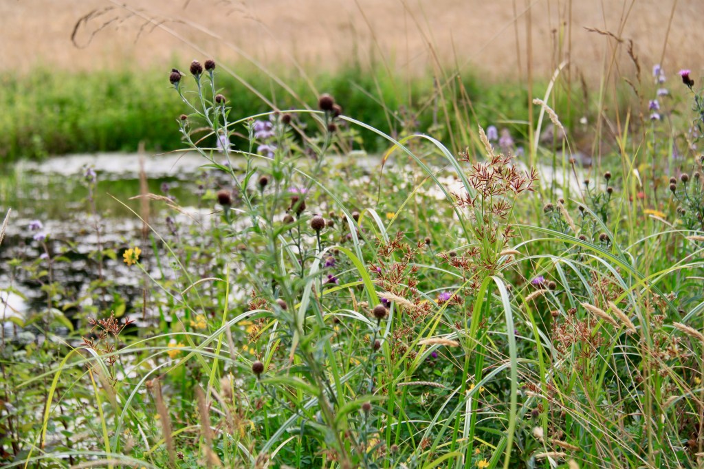 There are little pockets of respite from the browning off plants, with the pond and stream supporting almost a metre of lush green growth, before the straw colours reign.