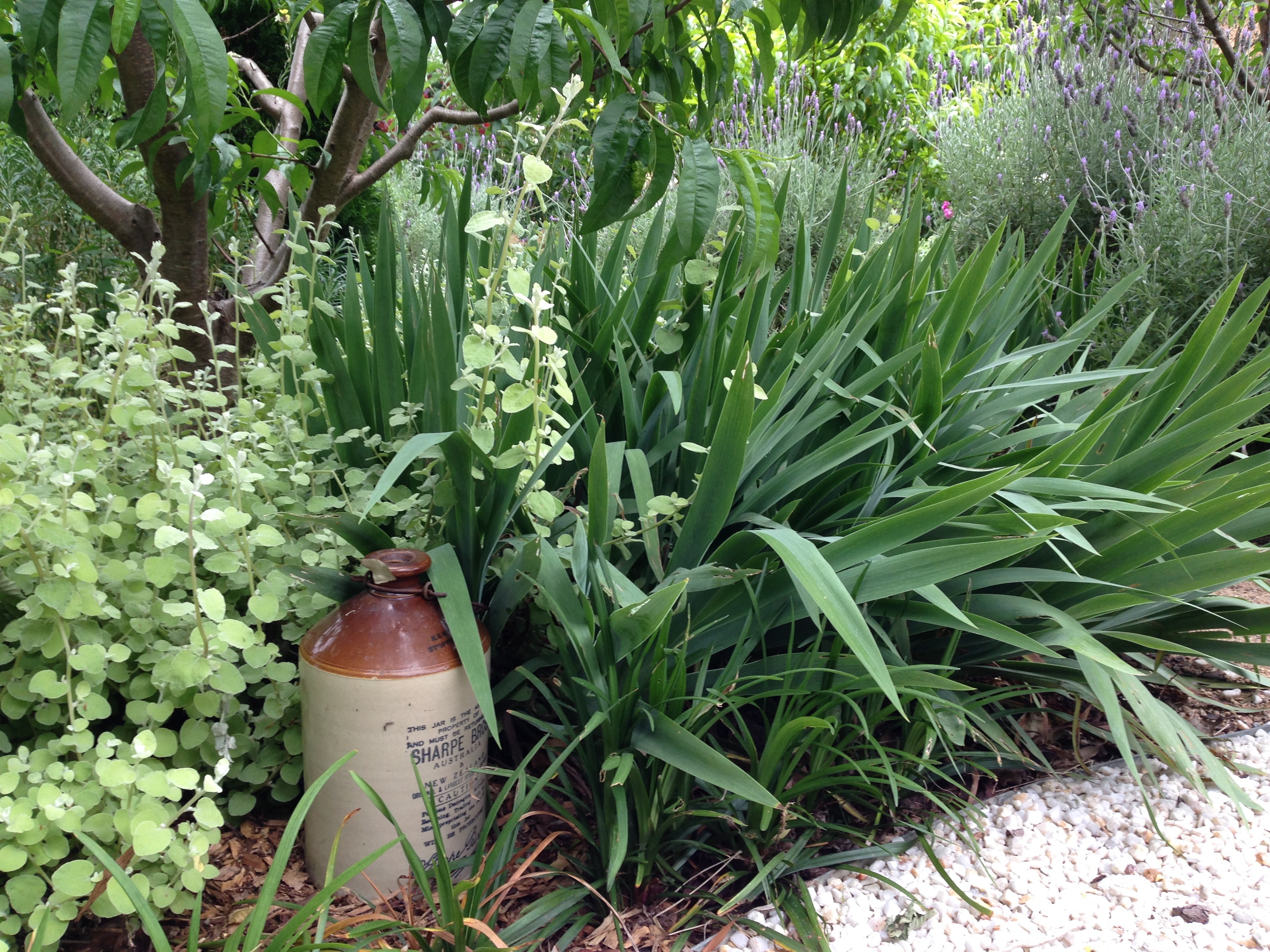 Stoneware jar peeps out from the Helichrysum under the peach tree at Woodcote – the colour combinations are superb