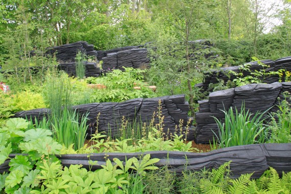 Andy Sturgeon’s M&G Garden. The burnt oak structures were inspired by natural rock formations Andy saw on an Australian beach