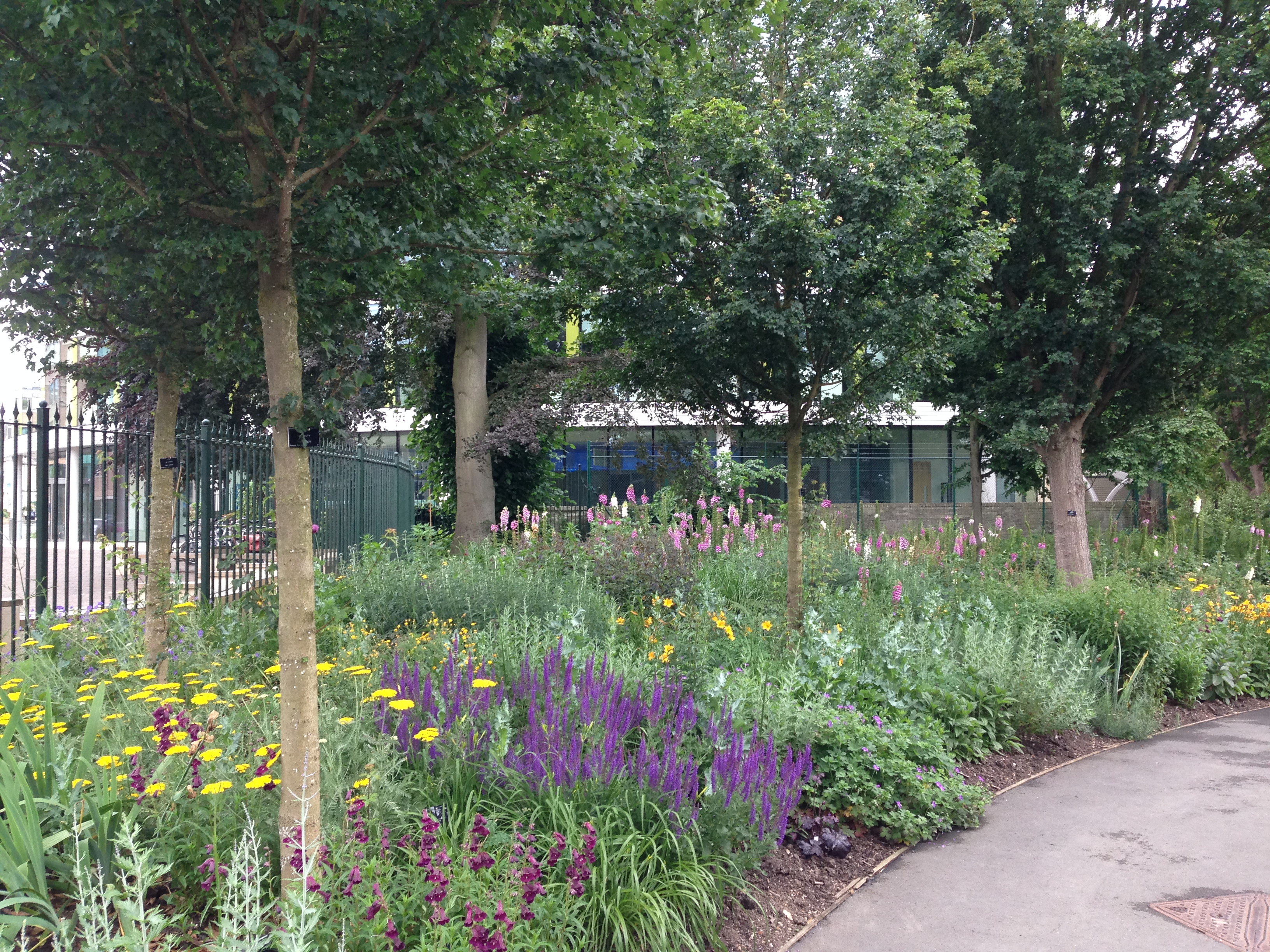 Mathematical Bridge, above, has been anchored by a beautiful mix of mostly herbaceous perennials with a simple colour theme. This ties in with a deeper bed across the grass (photo to left), which used to be a much less attractive car park. Here an extended colour range brings a cheerful welcome at the porter’s lodge.