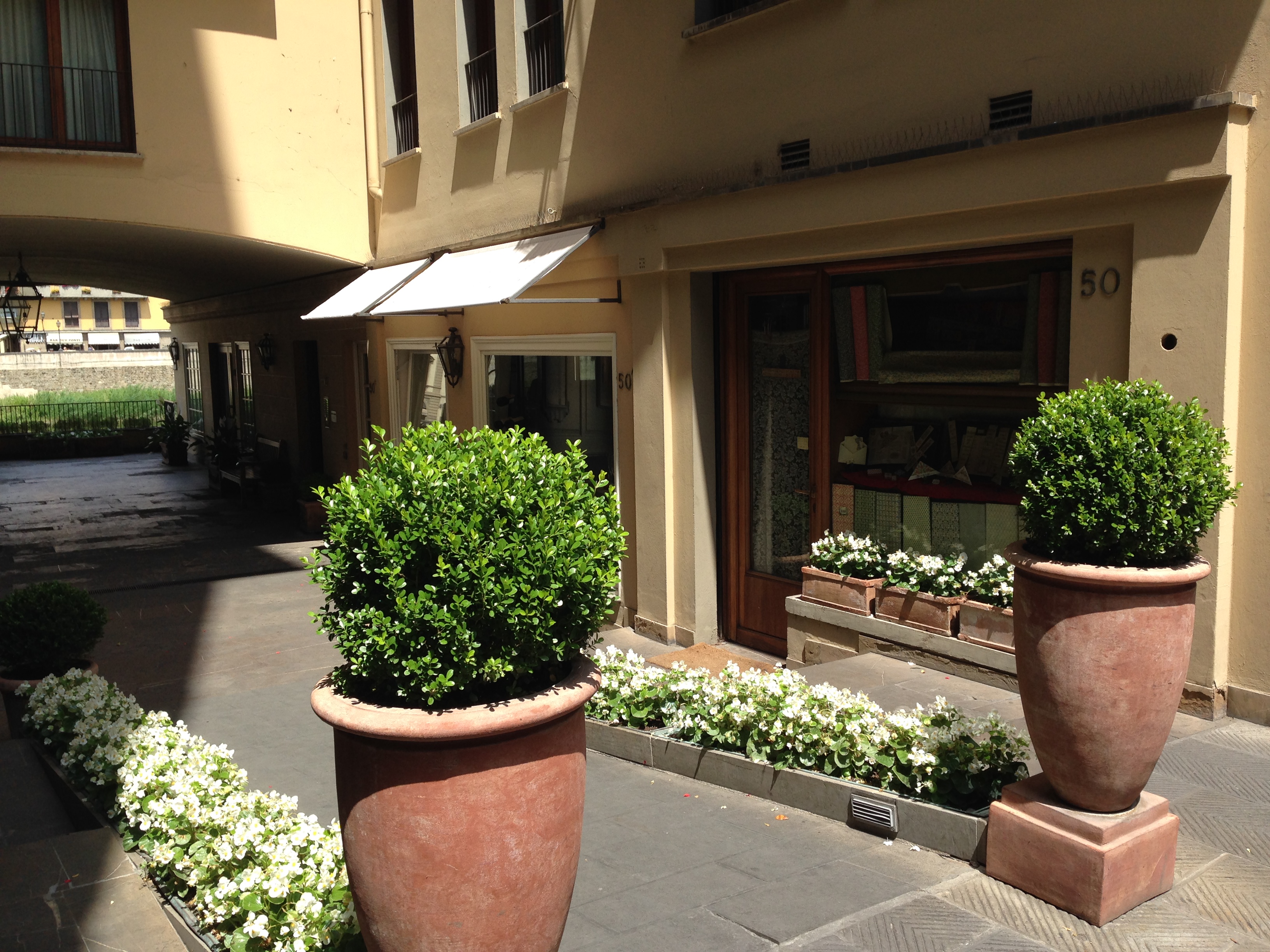 Again, at the entrance to Hotel Lungarno in Florence, which incidentally is a wonderful place for lunch looking over the river, you see this simple display of plants. Buxus balls in terracotta pots and simple, repeated, white Begonia. So often a similar planting would mix whites and pinks or a couple of different plant types, but simple is often more visually attractive. More examples of this simplicity are shown in the photos below: