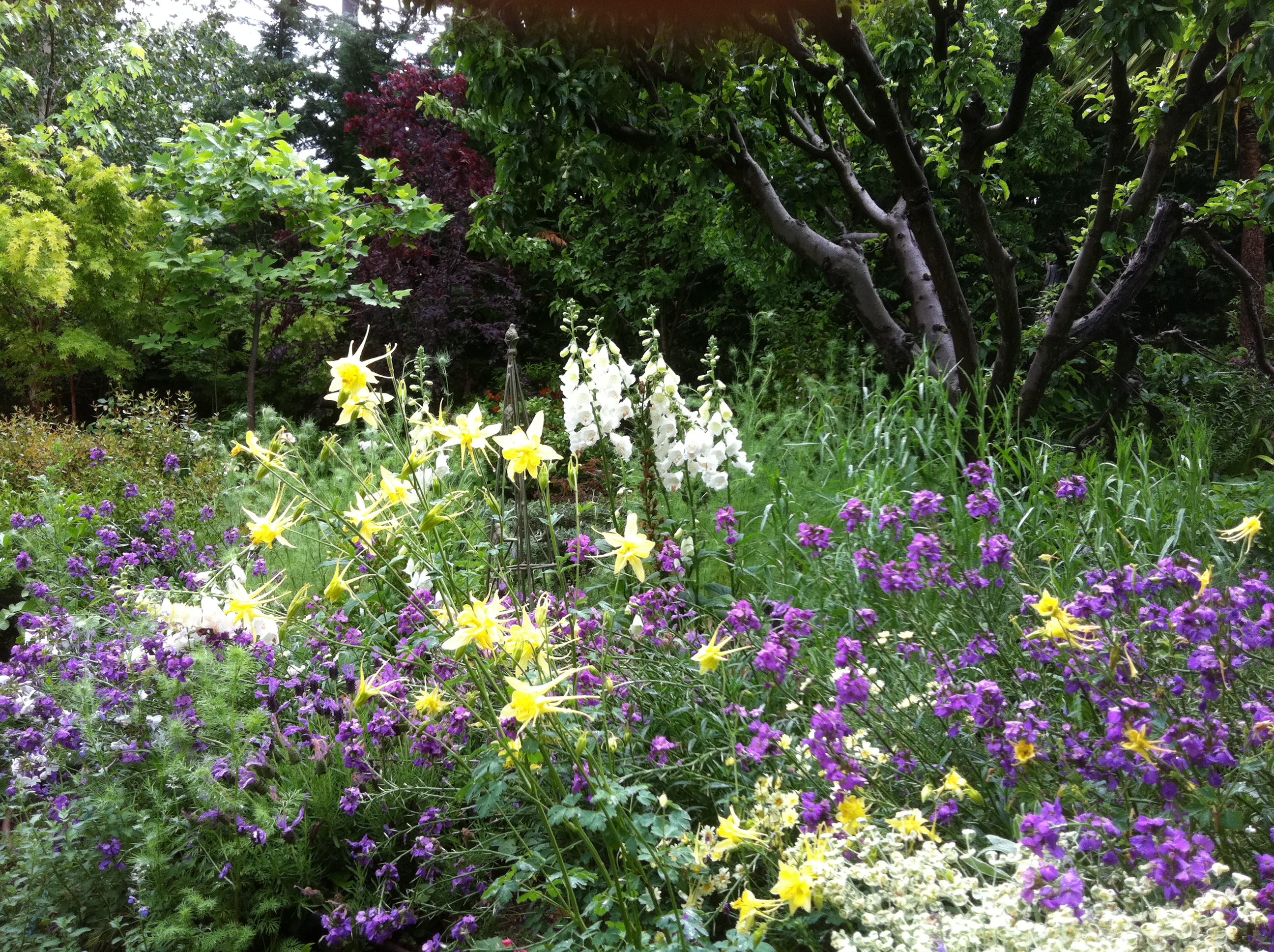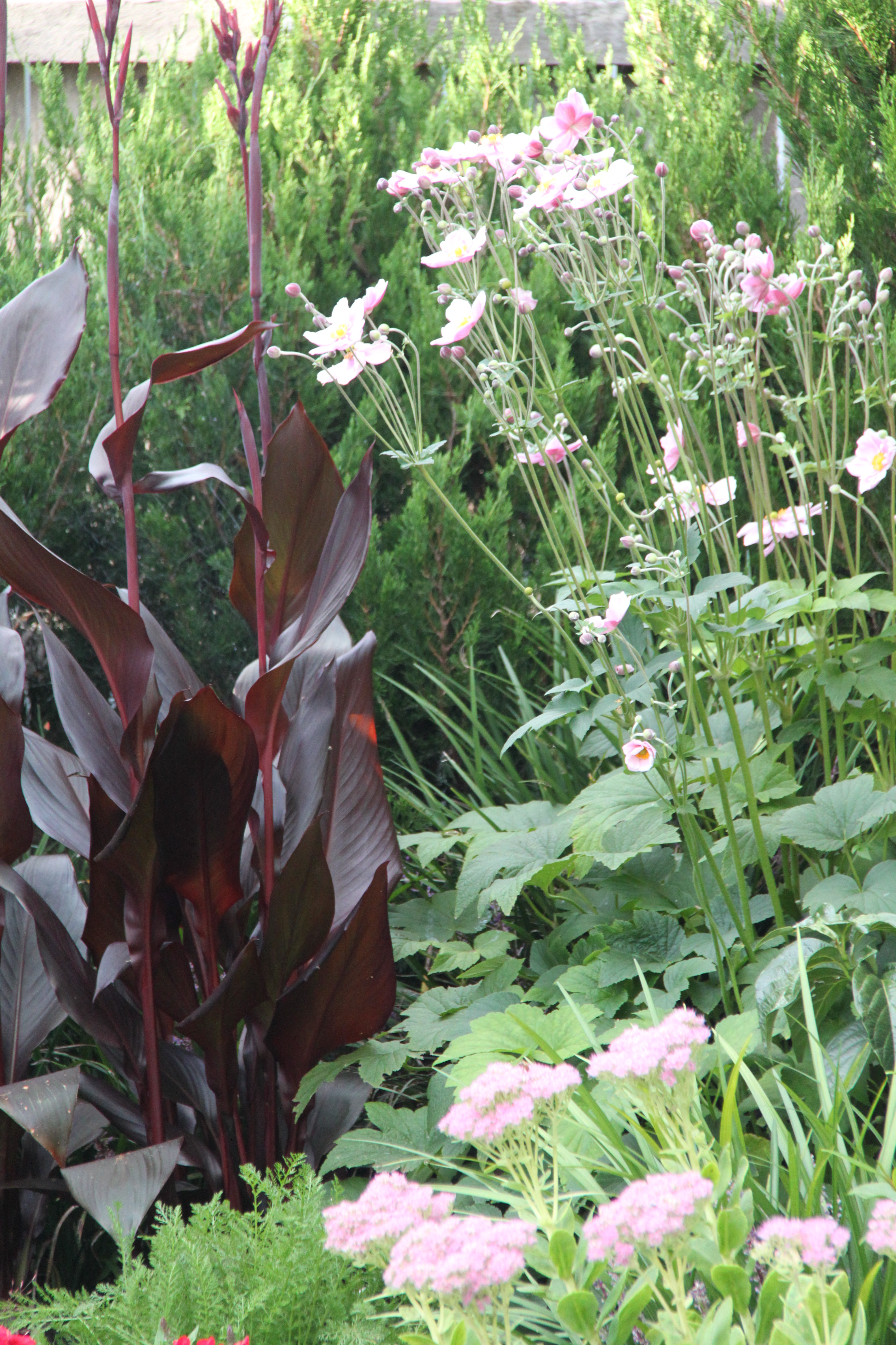 The photo to the right is a mix of perennials in my own garden. Here, I have planted Anemone, Sedum, Achillea, Canna, Liriope and Pelargonium against a deep green Juniperus chinensis ‘Spartan’ backdrop. The pinks and burgundys lift the greens whilst giving a soft effect. The Echinacea in front of the Canna will soon grow up to bridge the differences in heights and bring pink flowers through into autumn.